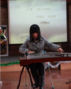 李�晖同学为大家演奏了古筝曲《渔歌唱晚》。李�晖同学的演奏旋律古朴和谐,谐婉流畅,时而幽静恬淡,时而热烈奔放,曲调优美, 意境深远,情感丰富而真切,让我们不由自主沉湎在这迷人的诗情画意之中,充分体现了自己高超的技艺。