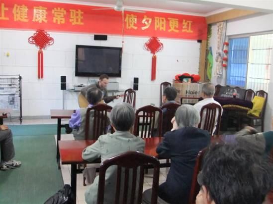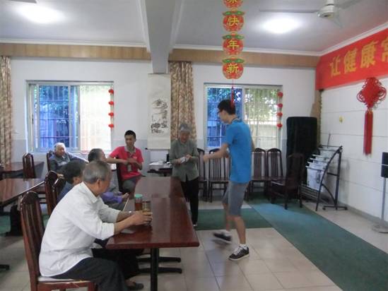 爷爷奶奶们陆续都过来了,就主动提出让我们表演节目,身为工科生的我们虽然不能表演得多专业,但还是尽力地表现自己,以不辜负老人们的期待。我们所的德国留学生马特真是给力,先是来了两首吉他弹唱,尽管大家都听不懂德语,但那优美的旋律仍深深地吸引着大家,引来大家由衷的赞叹。再来是志愿者的改词版的蓝精灵,将活泼的同学和可爱的老人比作蓝精灵,欢快的音乐更是活跃了表演的气氛。叶志斌同学则是精心准备了两个魔术,第一个魔术因为我这个“托”的失误,失败了,倒是引起了老人们兴趣,可算是意外的收获吧。第二个则非常顺利地完成了。接着进入大合唱阶段,一曲《听妈妈讲那过去的事》引起了老人们的共鸣,不少老人跟我们在一起轻唱;“歌舞秀”——《最炫民族风》我们使尽了浑身解数来博老人一笑;最后我们在浙大校歌中结束了我们这次志愿者服务活动,给本次活动划上圆满的句号。