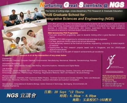 9月20日晚, 新加坡国立大学综合科学与工程研究生院有关负责人将来我校玉泉校区举办招生宣讲会。欢迎对此有兴趣的学生前去参加。时间地点等安排如下: