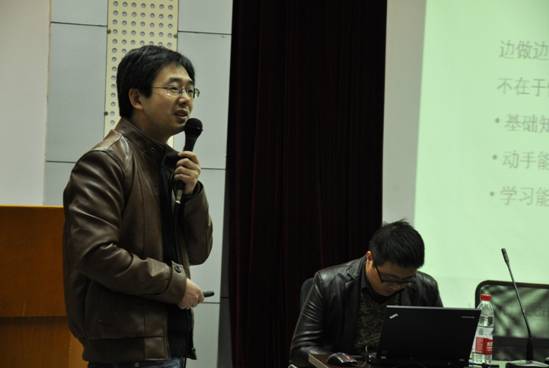 在嘉宾分享环节中,四位嘉宾分别就求职准备、职业规划及今年就业招聘情况等方面进行了介绍。蒋小伟先生以“行健 致远”为主题首先发言,针对目前IT业各大公司招聘情况、毕业生就业准备等问题进行了分析。他表示:就业是学生与企业的双向选择过程,同学们在求职的过程中,除了要明确自己的需求外,一定要考虑到自己能够为公司带来的益处;此外,职场不同于校园,身份的转换对于初入职场的新人也是一个艰巨的任务。蒋先生在华为公司从事人力资源工作多年,他从自身的亲身体验出发的分享,为同学们思索求职提供了全新的角度。