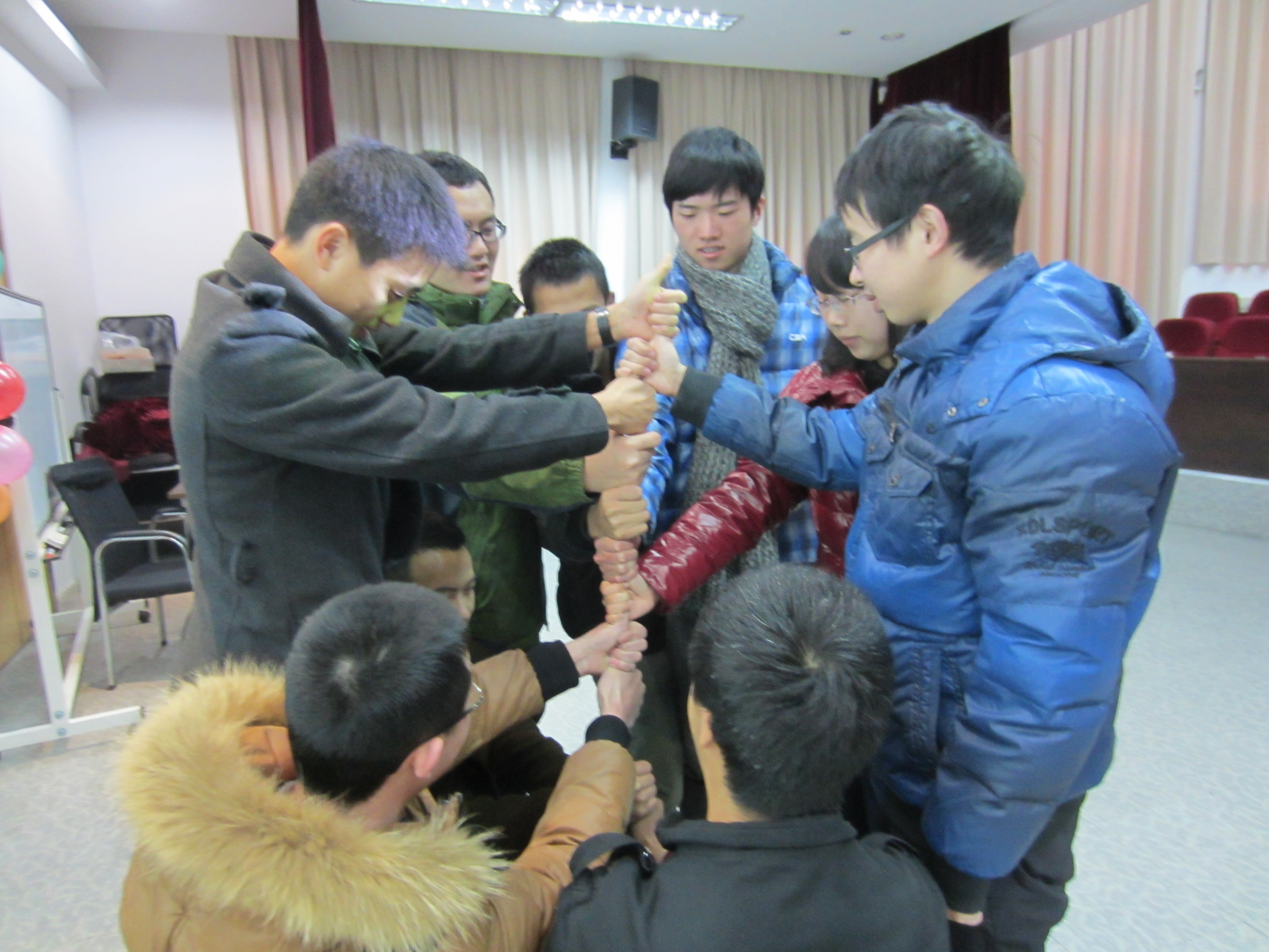 接着,同学们在费老师的指导下开始了第二个活动。同学们需要保持彼此手连接的情况下,拼出各种各样的图形。这个活动看似简单,但是也是对同学们创造能力和团结协作能力的考验。大家冥思苦想,反复尝试,拼出了各种各样有趣的图形,活动的气氛也在这时达到了高潮。这时,第三个游戏也开始了,同学们先随意站开,然后和最近的同学把手拉起来,接着需要把已经十分混乱的圈子解开。同学们开动脑筋,经过一番艰苦卓绝的努力,终于成功解开了圈子,喜悦的笑容浮现在每个人的脸上。