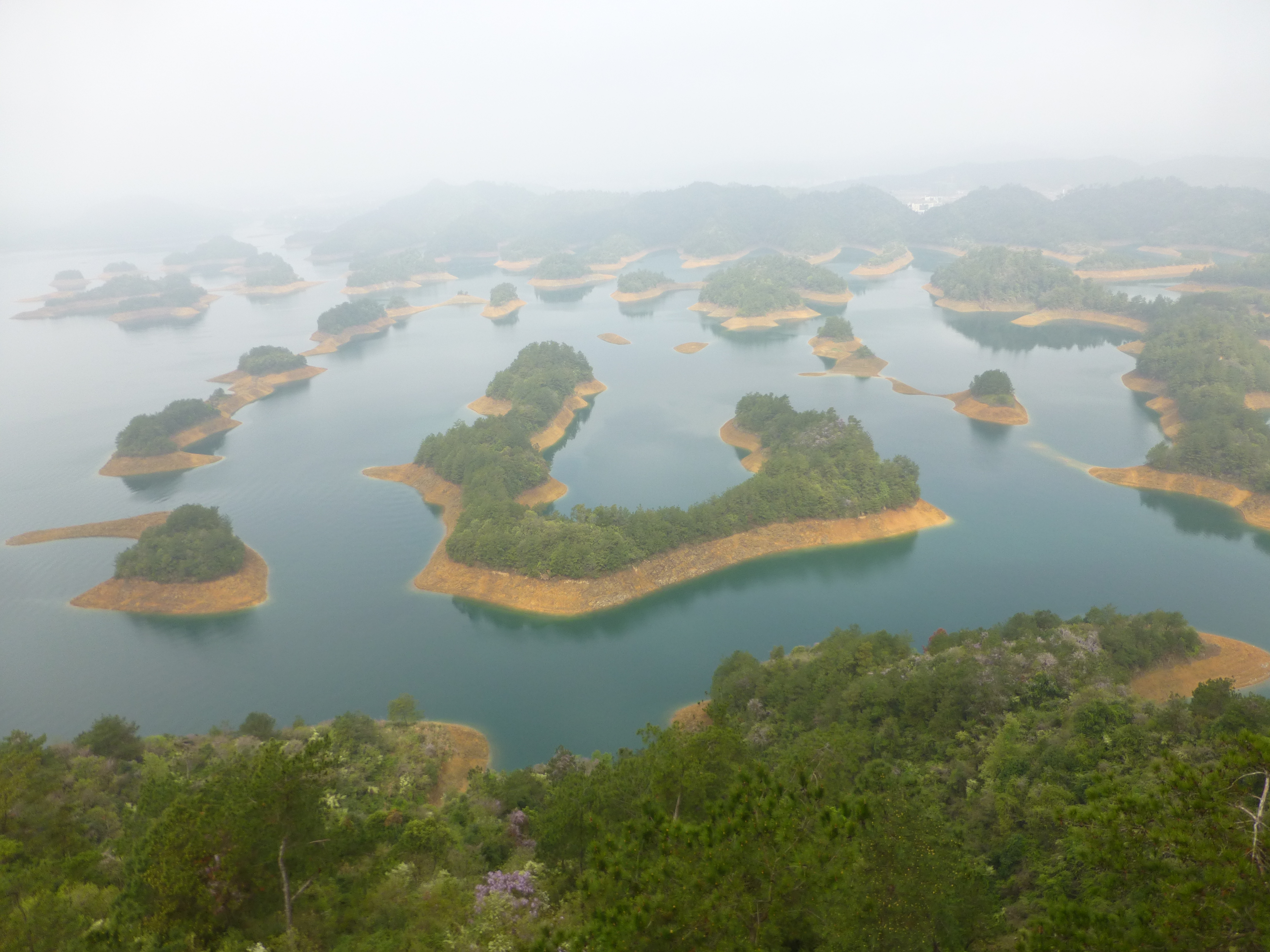 由于时间关系,第二天我们只游览了千岛湖景区C线的几个景点。最大的一个当数黄山尖了,山势不算很高,我们这些学生自然不乘缆车,列队上山了。爬到山顶,碧波前倾,深湛可人,岛屿也似散落的翡翠点缀其间,更令人惊诧的是,岛屿的形状往往忘去,可以看到“天下为公”四个字,令人称奇。登高望远的趣味,在于一路艰险辛苦,登顶之后,可极目而视,俯瞰远近。这爬山的过程也和科研类似吧。