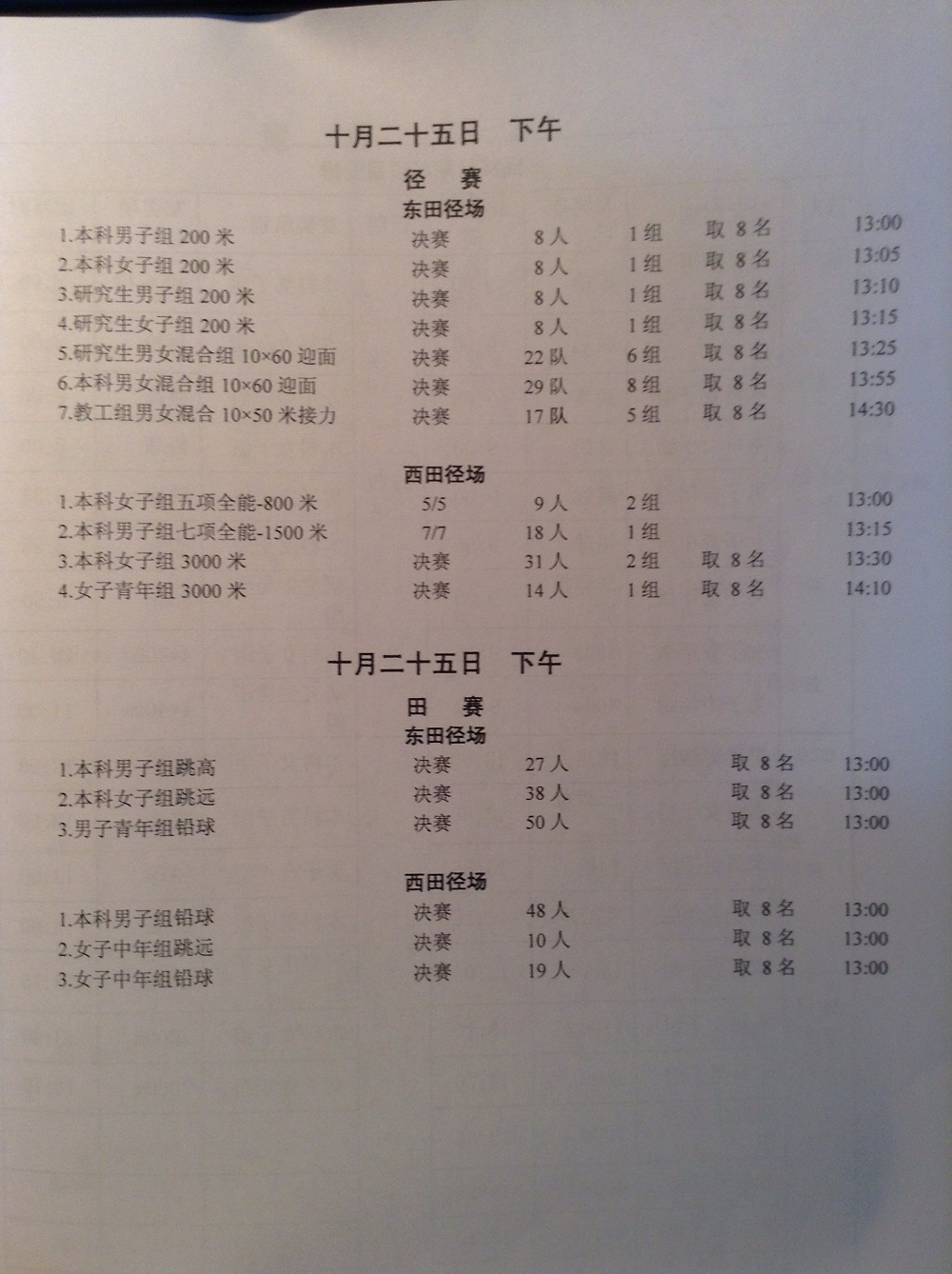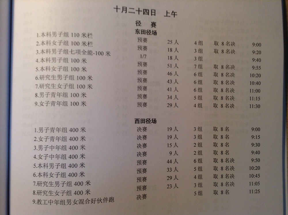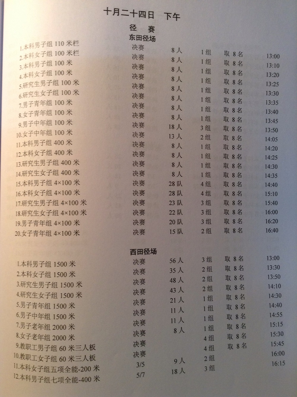 现附上项目时间地点安排表及运动员号码等情况,请大家核实。由于学校还没有正式电子版的秩序册,附上赛程安排图片,仅供参考。