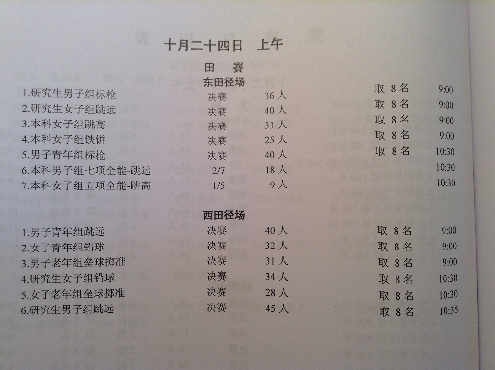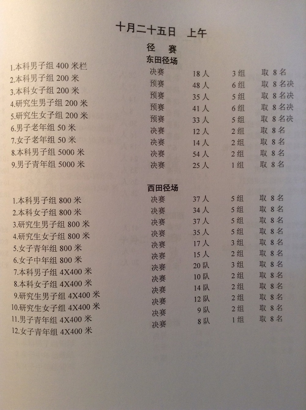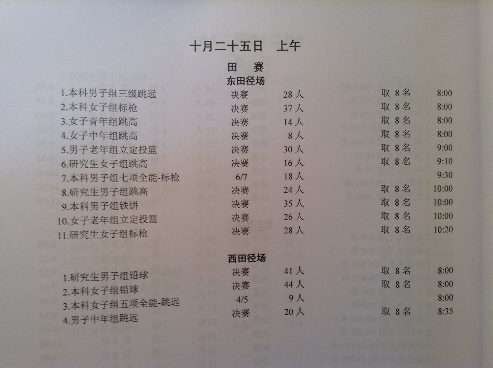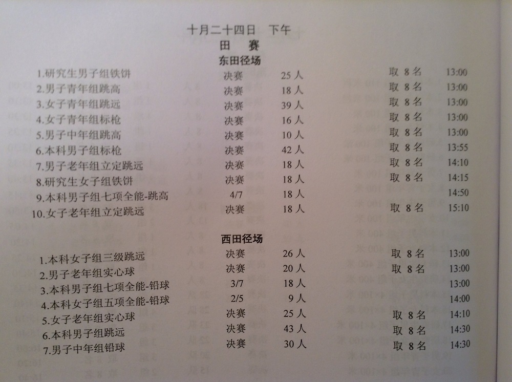 现附上项目时间地点安排表及运动员号码等情况,请大家核实。由于学校还没有正式电子版的秩序册,附上赛程安排图片,仅供参考。