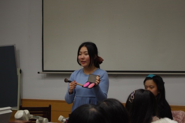 随着老师抛出的一个接一个的问题,美妆培训正式进入正轨。当然美妆培训从实际演示开始。从皮肤打底出发,老师用实际的例子教会我们选择适合自己的隔离霜,依据自己的肤色采用相应颜色的互补方法,就像泛红的皮肤用绿色的隔离霜调和,泛黄的皮肤用紫色的隔离霜来提升气色……使用BB霜时要先一点一点压上,随后用海绵铺开,使它更涂抹的均匀;在画眉时,选用与头发、眼睛颜色相近的眉笔;选择唇色时,谨记偏黄肤色选择红色口红,偏黑肤色选用粉色口红……潘老师用一系列小技巧,包括演示结束后一对一的建议、化妆教导增加了这次培训的意义,让同学学有所获。