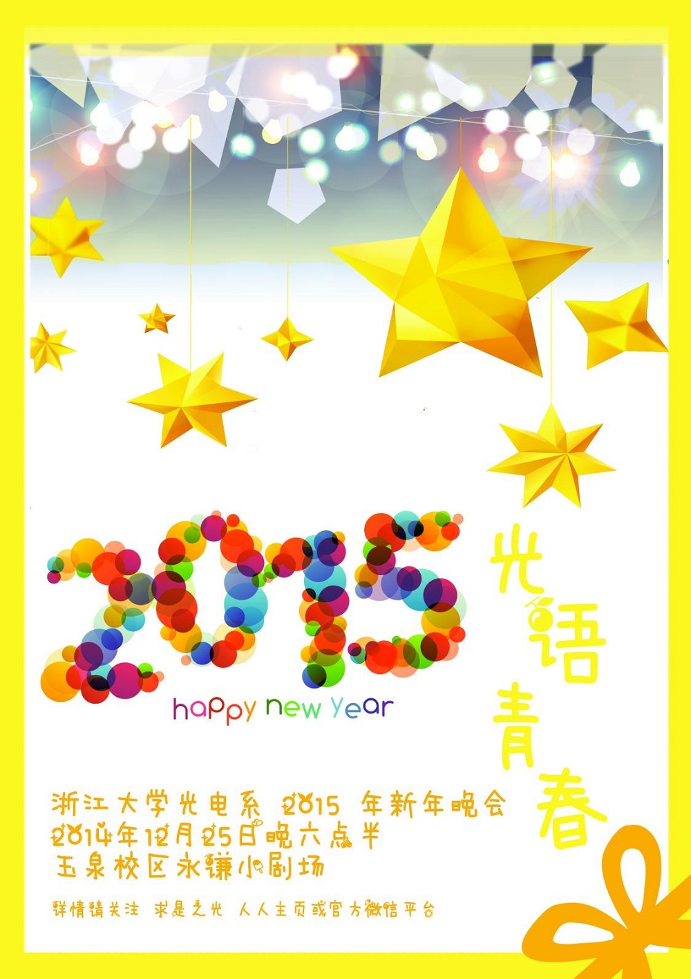 在这辞旧迎新之际,我们即将迎来2015国际光年,让我们一起回味2014,展望2015。光语青春——光电系2015新年晚会将于2014年12月25日(周四)隆重上演。目前晚会的各项筹备工作正在有序进行,现将晚会相关信息通知如下: