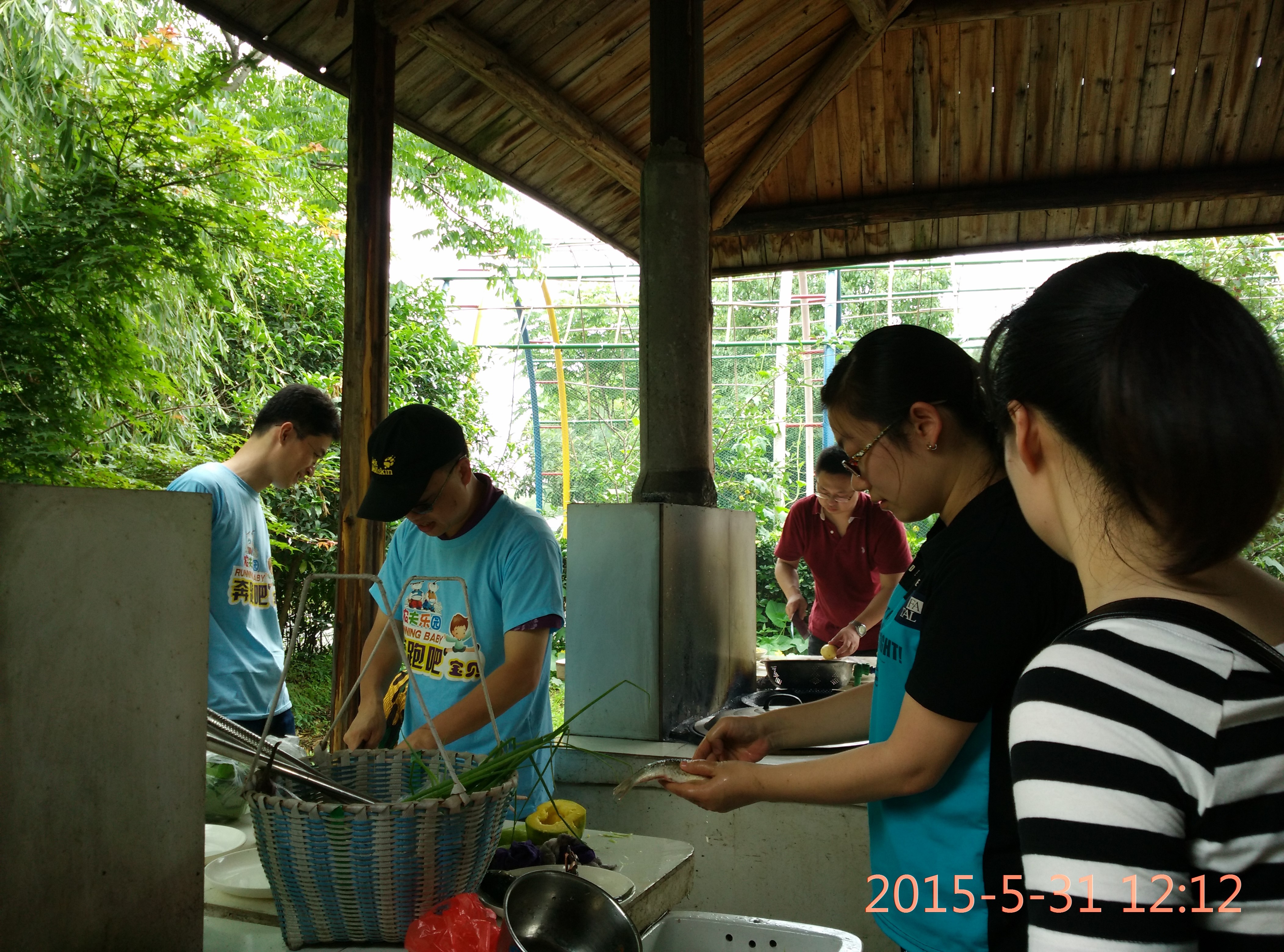 经过爸爸们的努力,干塘捕鱼中我们收获了8条鱼,刚好够我们每桌2条,饥肠辘辘的各家宝宝和家长们一起动手,利用分得的食材以及乐园中的土灶,开始做饭了:有人烧火、有人洗菜、有人切菜、有人下锅……一个个忙碌的身影,经过1个多小时的折腾,一份份美味的大餐在我们眼前了,因为是自己动手做的,大家吃的格外有味。