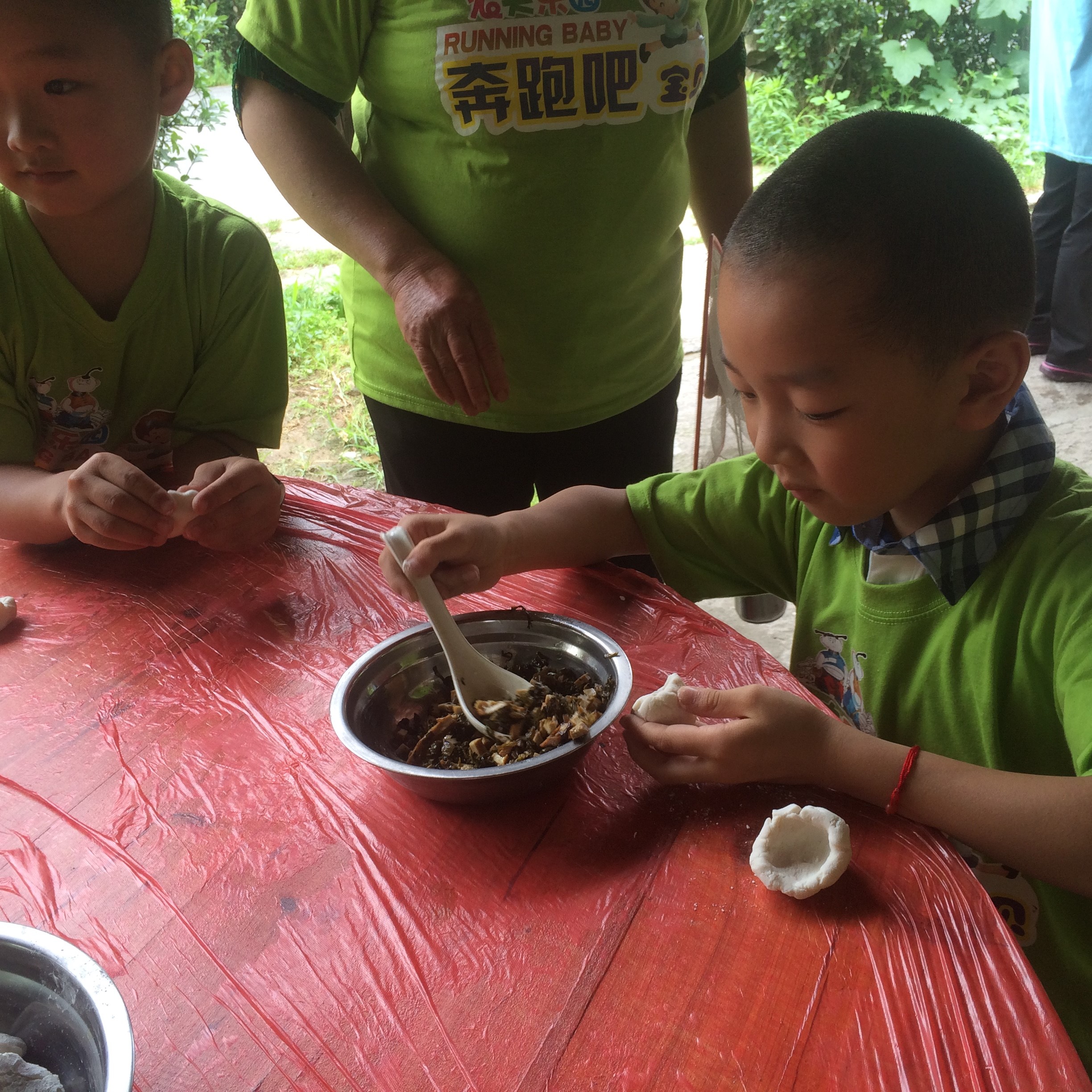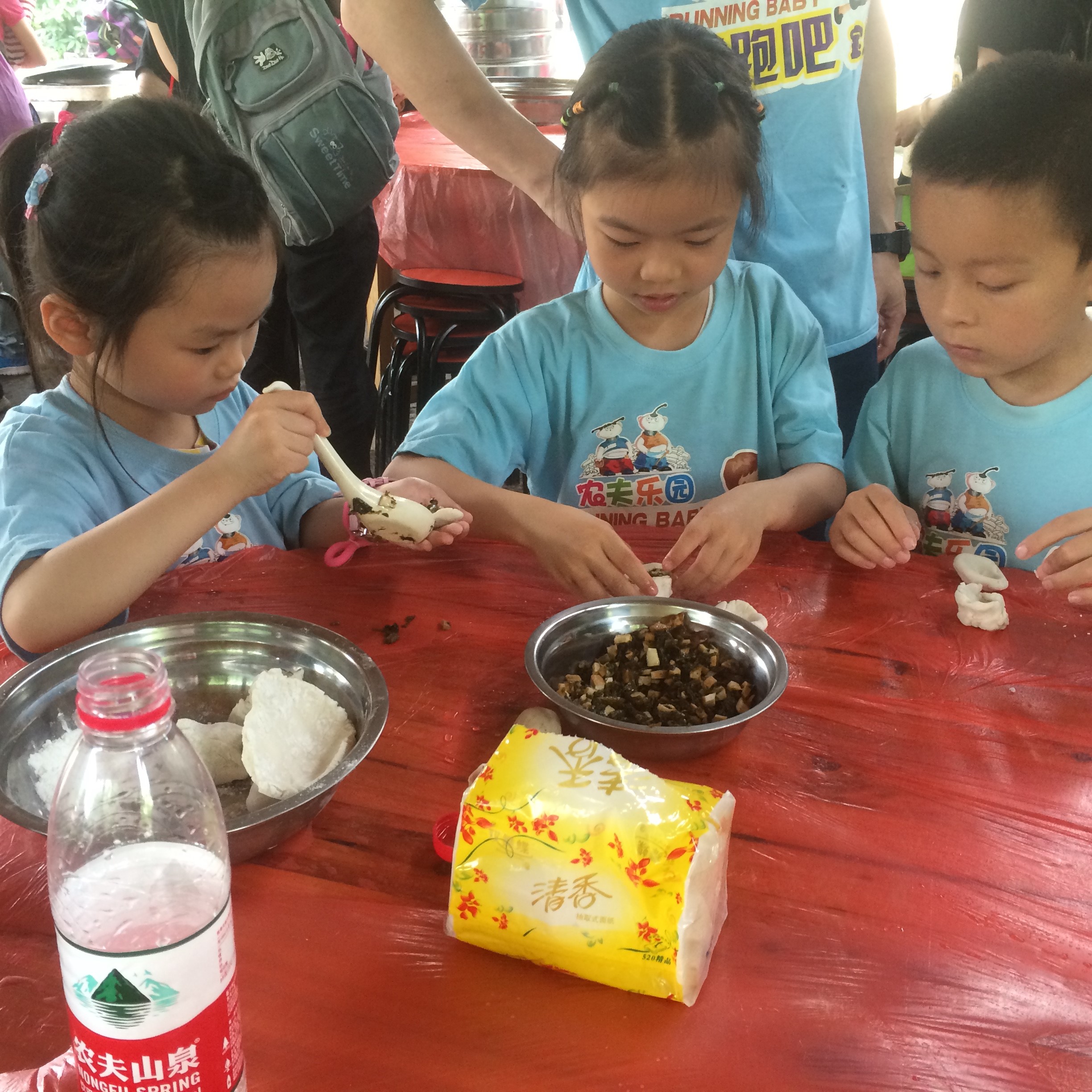 第一个活动是自制点心——创意包子。小朋友洗干净自己的小手,拿起面团开始学习做包子:首先将面团揉圆,接着要挖一个洞,逐渐的让这个洞变大最后要形成一只碗的形状,添加肉馅后再搓圆,熟悉了流程后孩子们就开始发挥自己的想象:“五角星包”、“乌龟包”、“恐龙包”等各式各样的包子呈现在了家长们的面前,煮熟后尝尝自己做的包子,孩子们体验到了劳动的快乐。