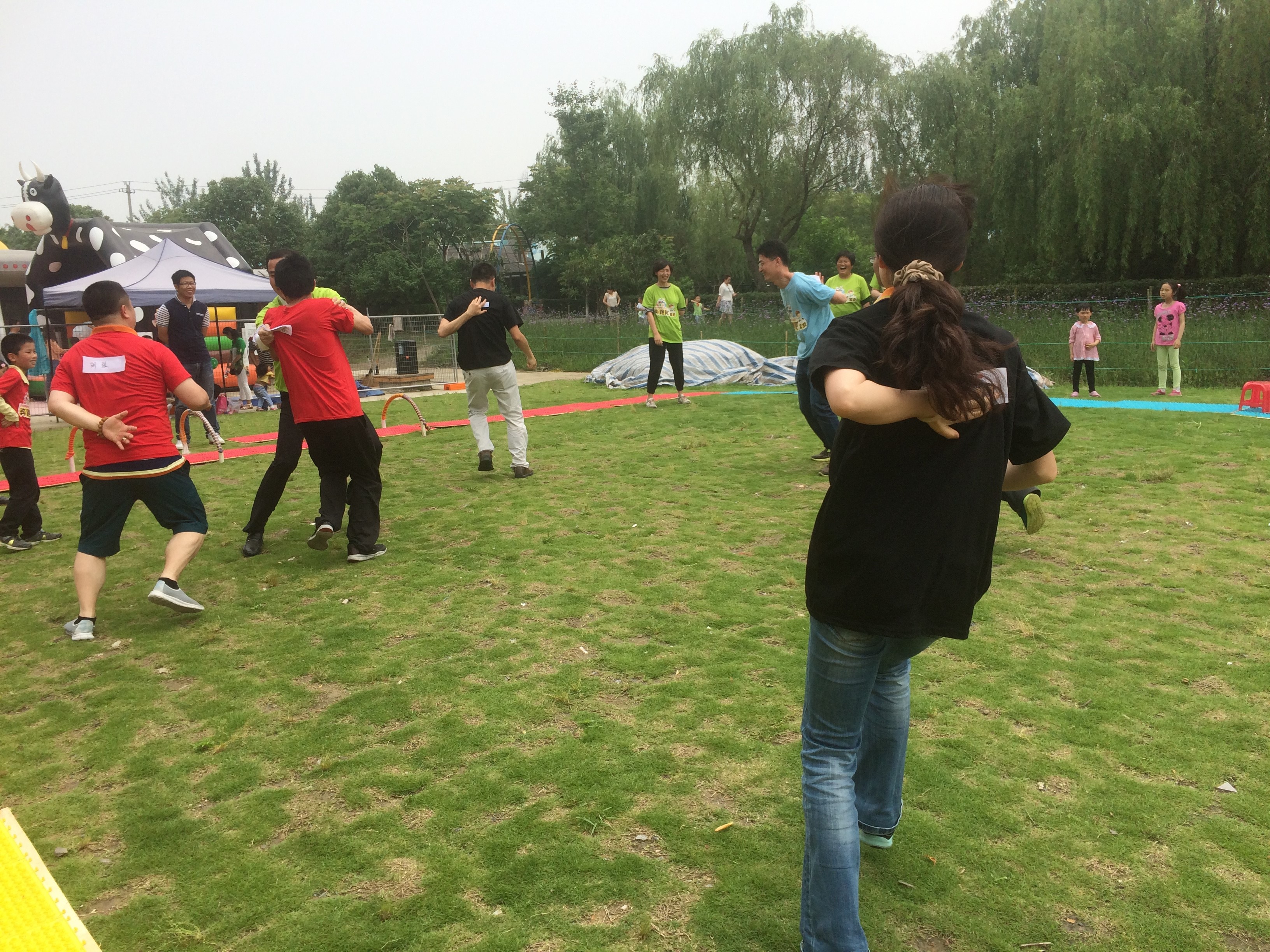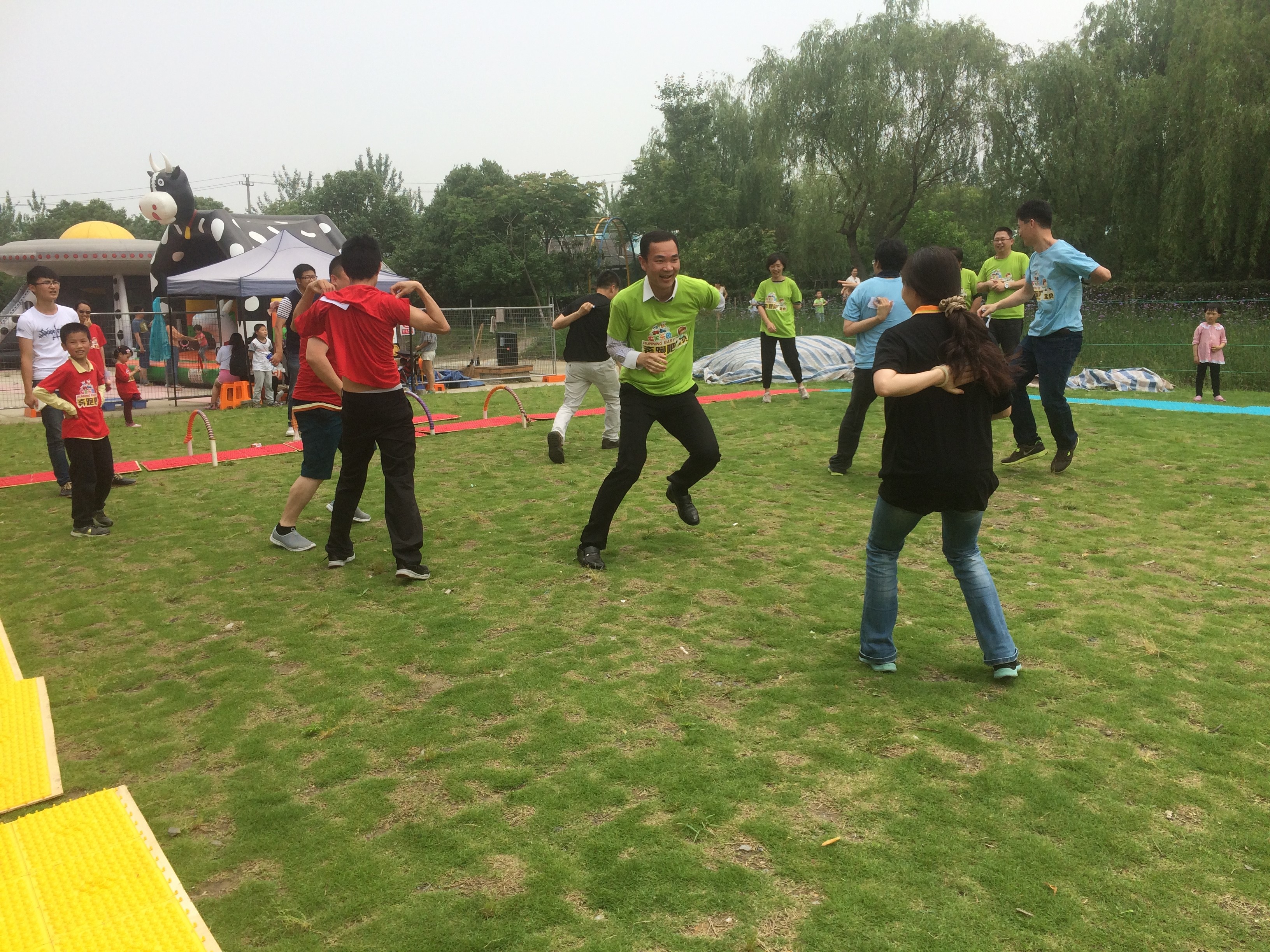 第二个活动是要在趾压板上进行跳绳、跨栏、爬山洞等动作,最后看哪个小组用时最短,小朋友们竭尽全力奔跑着、跨越障碍物、爬过一个个小山洞,最后红队获得了第一名,孩子们比赛后轮到各位家长出场了,家长们在比赛中可谓“大出洋相”,通过这个活动热身也都放开了自己的束缚,全身心沉浸在有趣的游戏之中。