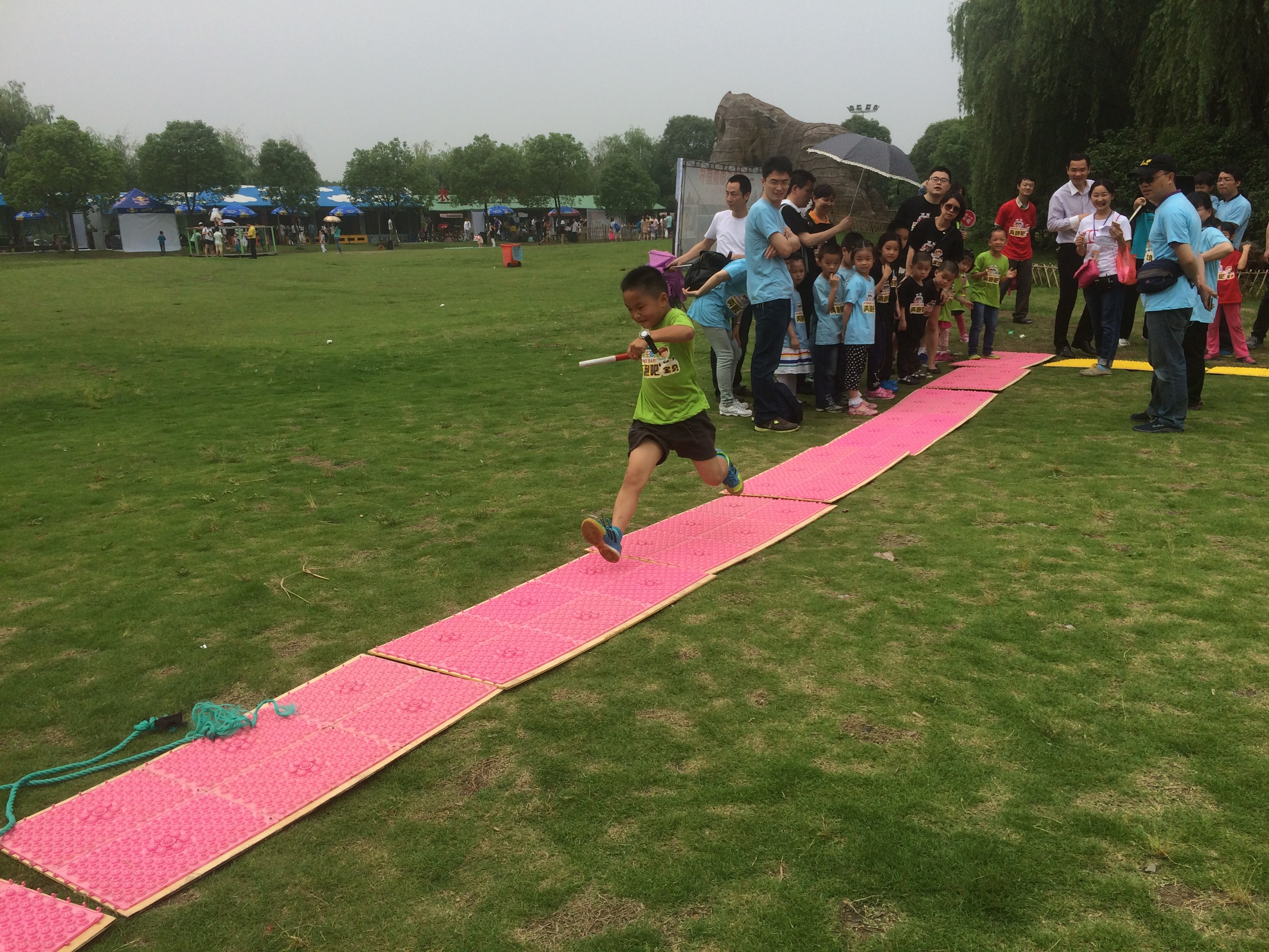 第三个活动是袋鼠跳,一个孩子一个家长这样轮着接力赛,孩子们刚开始很着急跳快了就摔倒了,接着慢慢调整节奏,一只只“小袋鼠”通过相互合作,顺利到达目的地,最后绿队获得了第一名。