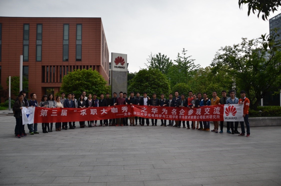 2016年4月27日下午,浙江大学光电科学与工程学院研究生会组织35名光电学院研究生到杭州市滨江区世界500强企业、通信龙头企业华为技术有限公司杭州研究院进行了参观交流,让大家切身感受世界500强企业的企业文化、工作环境以及对9月份即将到来的招聘进行提前的了解。