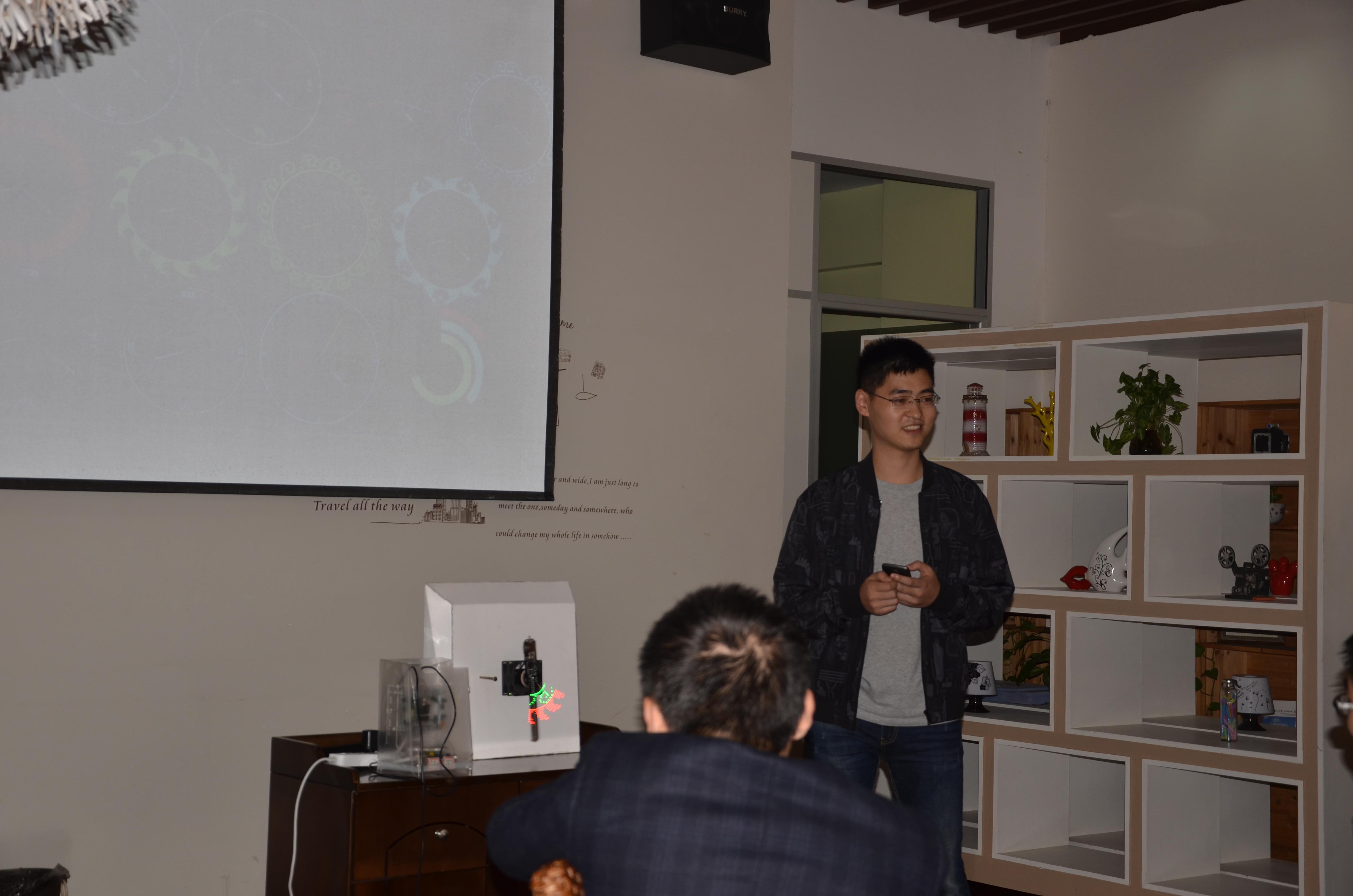 光电学院坚持开展“以学生为中心,以能力培养为主导”的“教授方法、学习方法、考核方法”的改革, 创导并开展自主性学习、研究性学习以及创新性学习,实施问题引导的协同讨论与同伴学习,案例牵引的项目 设计与课程研讨,科研和竞赛带动的探索与研究性学习,以及“优生免考”、“翻转课堂”等等教学手段,大 大激发同学们的学习主动性和积极性,通过这些课程改革,同学们设计出了很多优秀作品。2011级胡宇同学介 绍和演示了旋转LED;2013级马彬泽同学减少和演示了激光雕刻机;谢晨同学介绍和演示了光立方;冯逸鹤同 学介绍光电导航的无人机。这些作品种类繁多,理念富有创意。