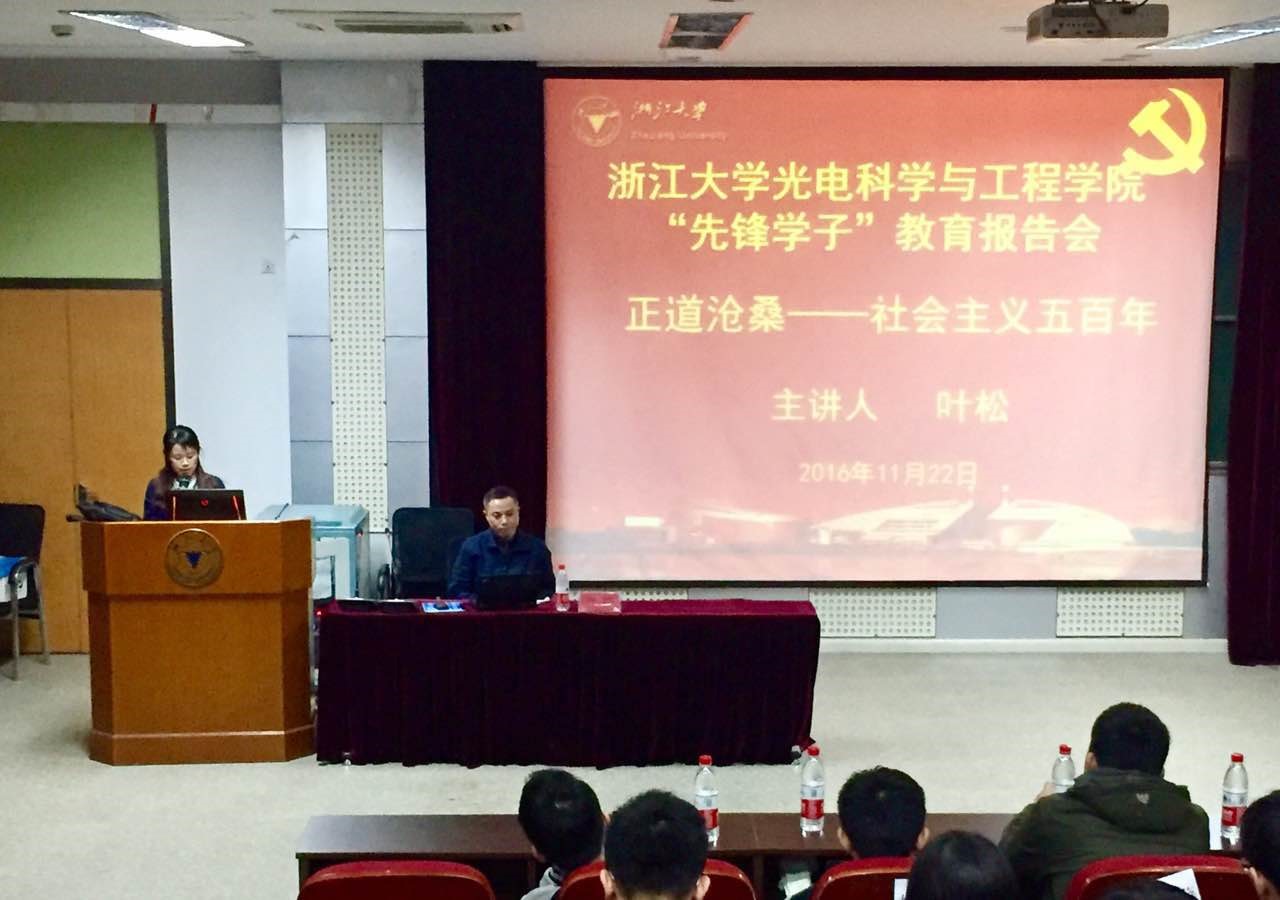 2016年11月22日下午,光电学院“先锋学子”教育报告会在教三301展开。本次报告会由光电学院党委书记叶松老师主讲,费兰兰老师主持,光电学院党委副书记刘玉立老师与光电学院各学生支部党员参加。
