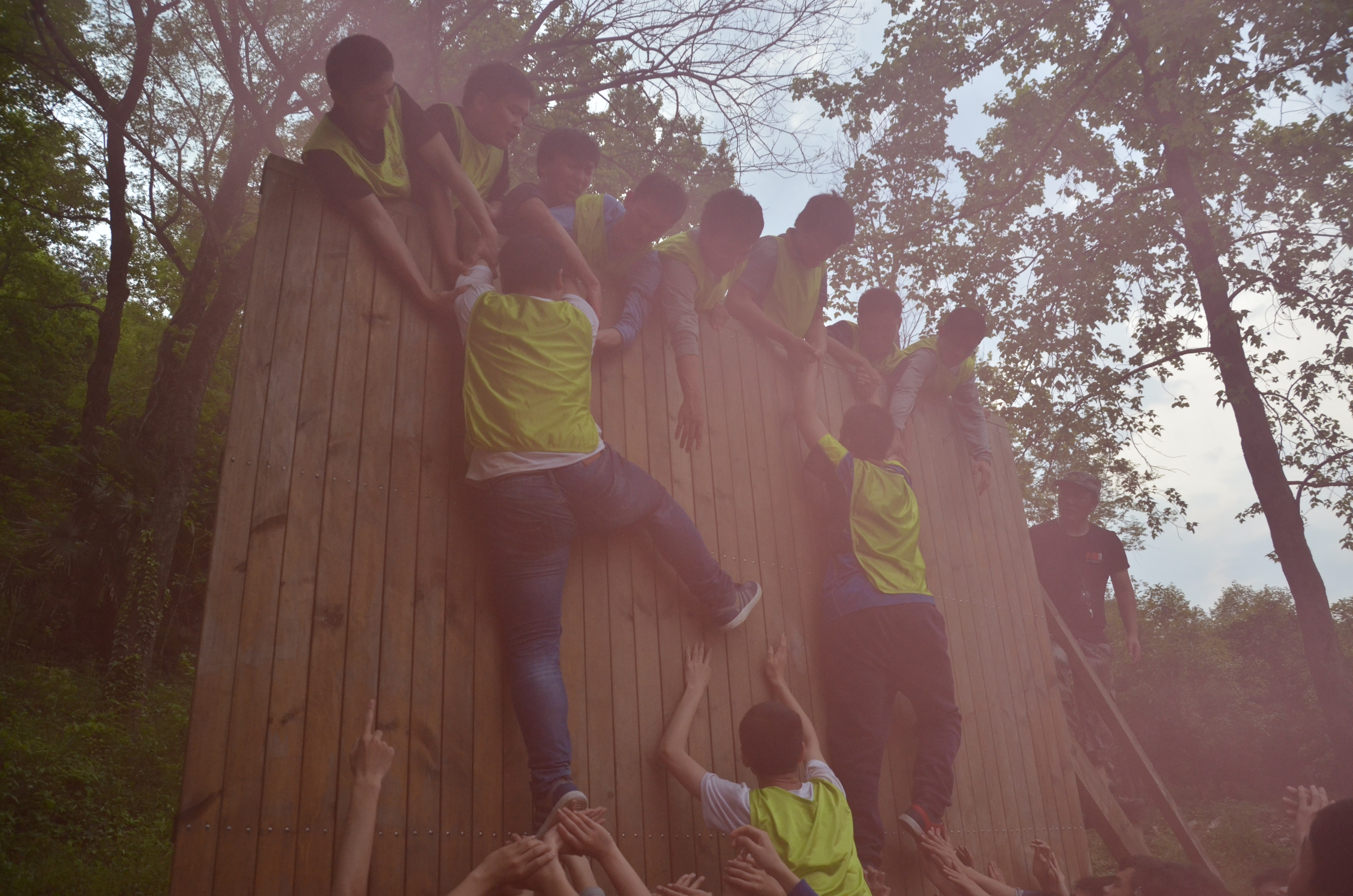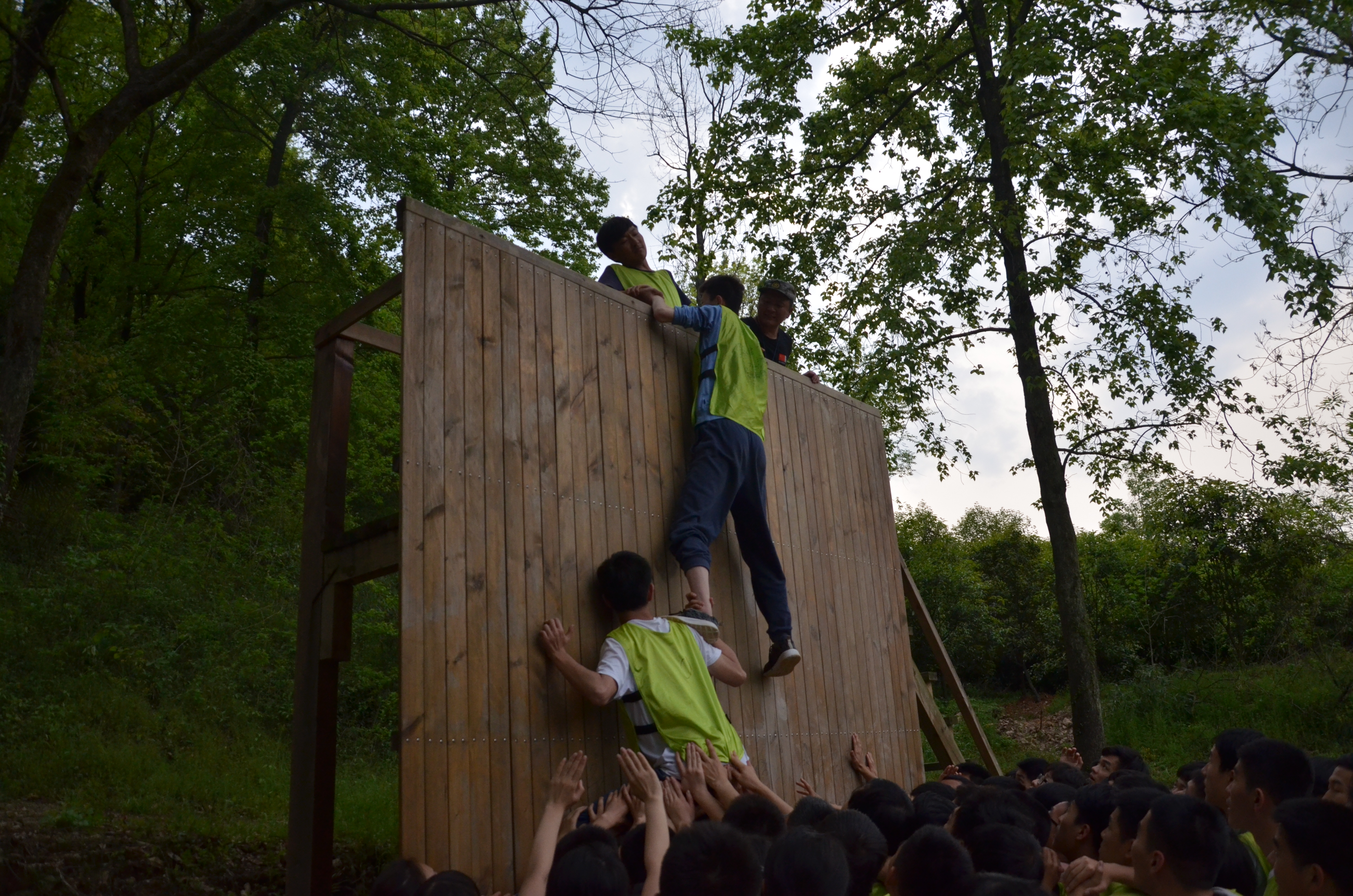 最后是“翻越逃生墙”的项目,这也是这一天中最具挑战性的项目。全队所有成员在规定的时间内翻越一面高4.2米的光滑墙面,在此过程中,大家不能借助任何外界的工具,包括:衣服、皮带、绳子等。所能用的资源只有每个人的身体。当需要同学自愿当“人墙”、第一个和最后翻越的同学,有许多同学主动站出来的时候,大家的激情都被点燃了。第一个同学由于无人在上方接应,所以需要临时两层人墙,同时也对他的臂力和腰力是一个巨大的考验。在大家的加油呐喊之下,第一位同学不负众望,顺利登顶。在一位同学的接应之下,第二位同学也顺利登顶,紧接着第三位、第四位……整个过程中,教官还设置了烟雾障碍。尽管烟雾刺鼻熏眼,但是当人墙的同学、在墙顶接应的同学仍然十分积极卖力,丝毫没有懈怠。最后,只剩一个同学时,伴随着同学们“不抛弃,不放弃”的呐喊,墙顶同学以倒挂金钩的方式,“营救”最后一位同学,最后一位同学也顺利登顶。这个项目让学员懂得个人目标与团队目标的关系,只有团队获得胜利才有真正的胜利。
