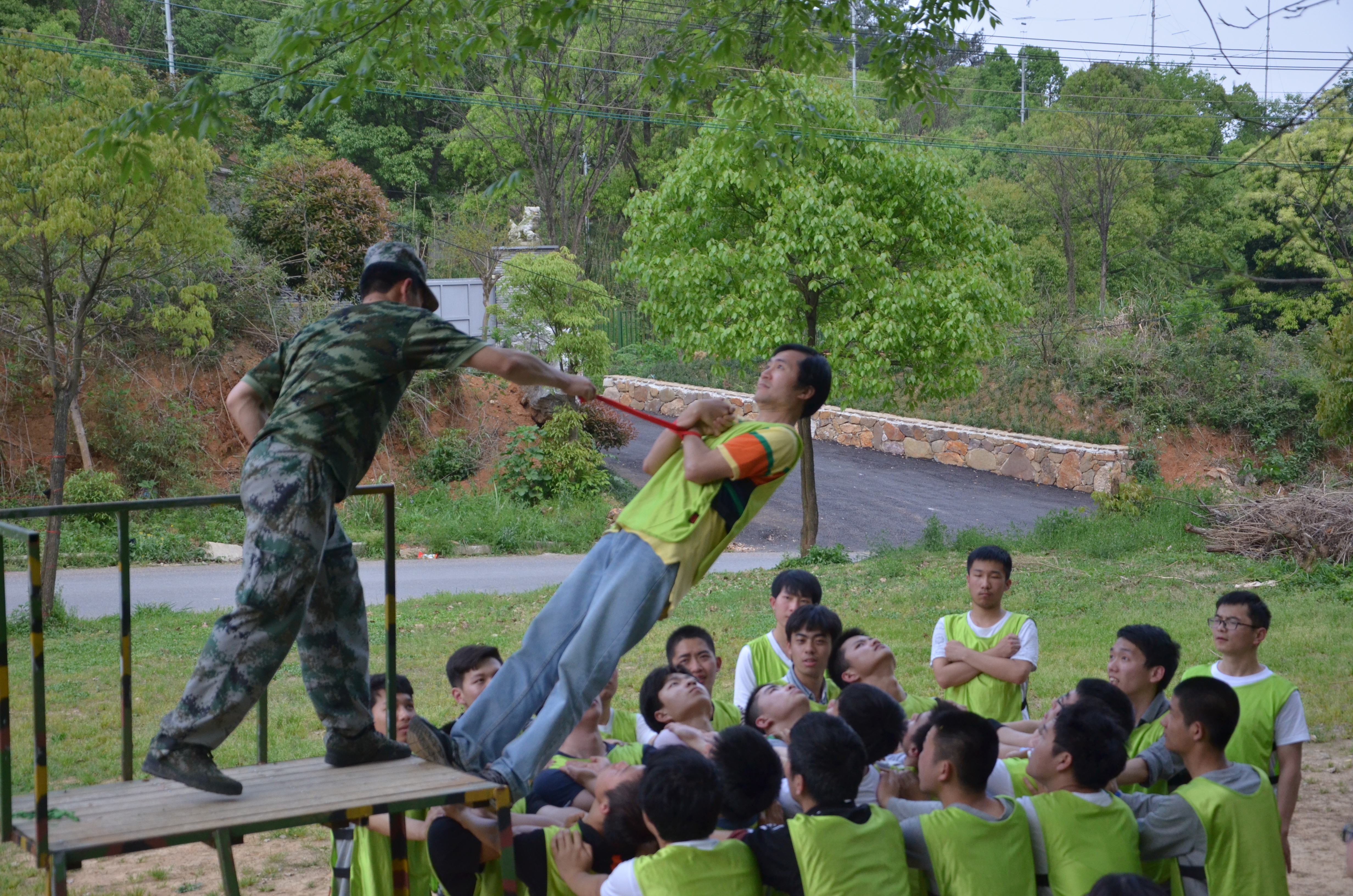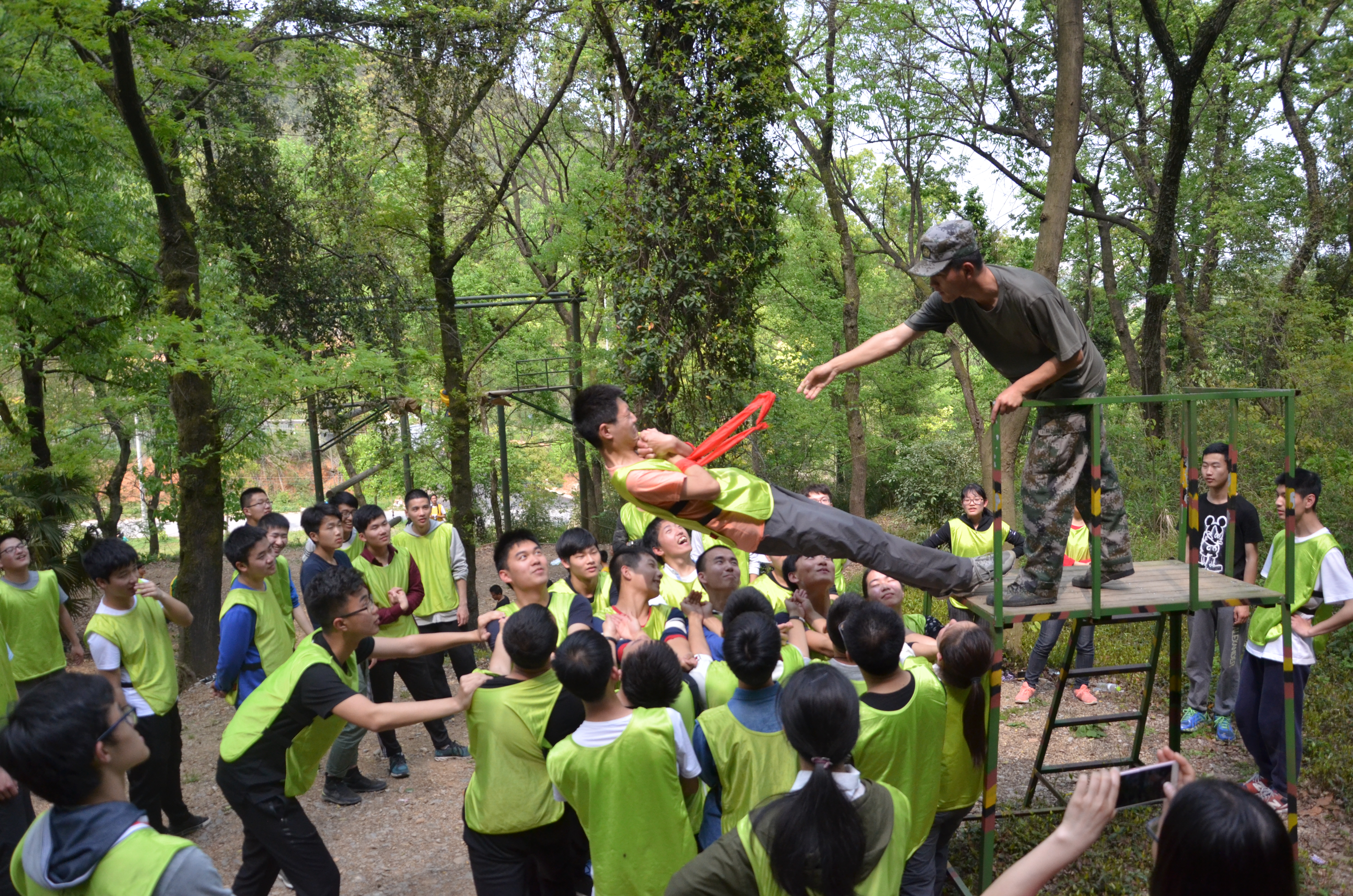 接着,则是“信任背摔”。要求同学从1.5米的高台处倒下,由下方五组同学接住。正如这个项目的名称一样,此项目非常考验同组成员之间的信任与同学的勇气。开始还有几位同学有些胆怯,但是渐渐地,“准备好了吗”、“时刻准备着,请相信我们”的口号声越来越洪亮,同学们也逐渐抛开胆怯,也感受到了彼此之间的信任。