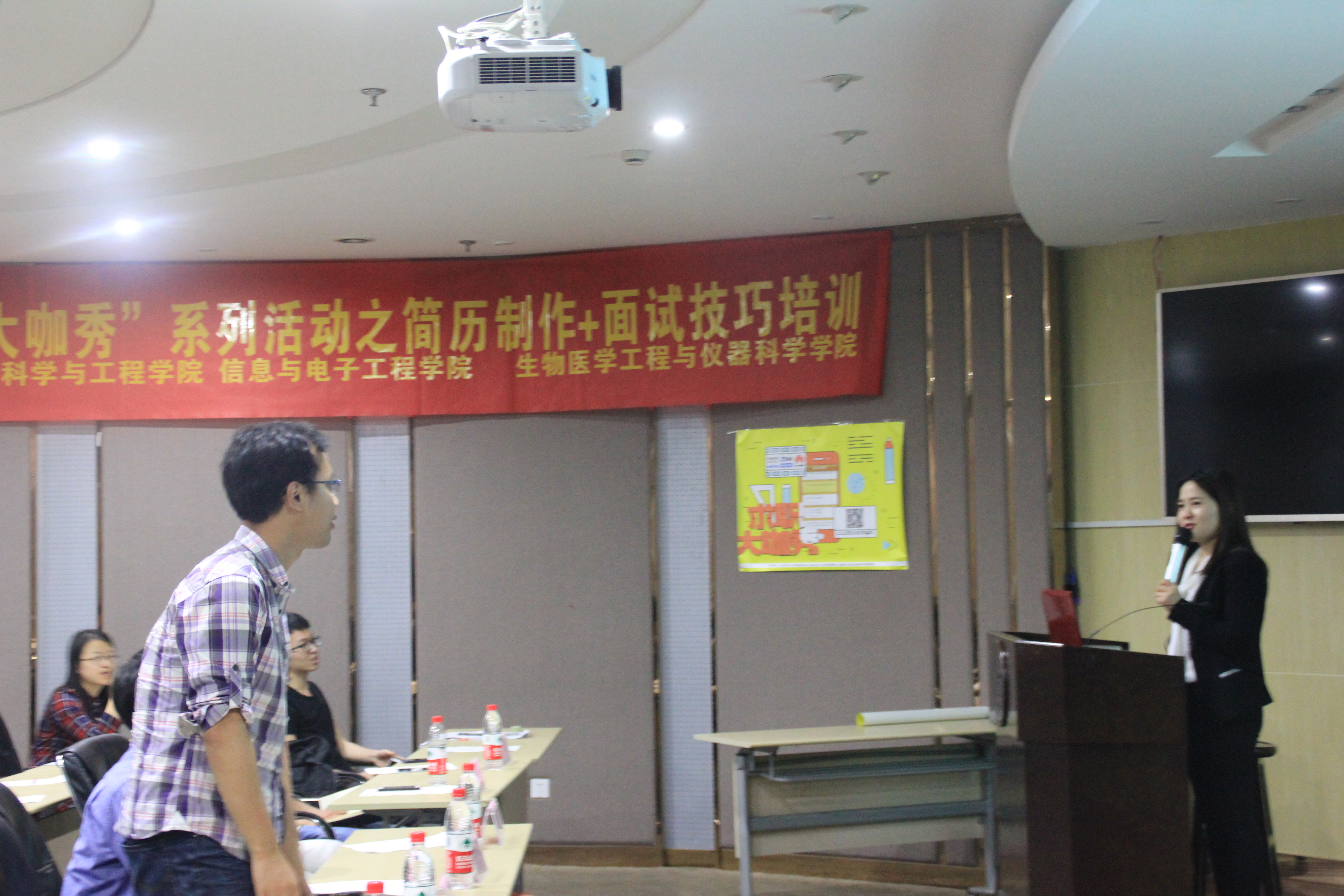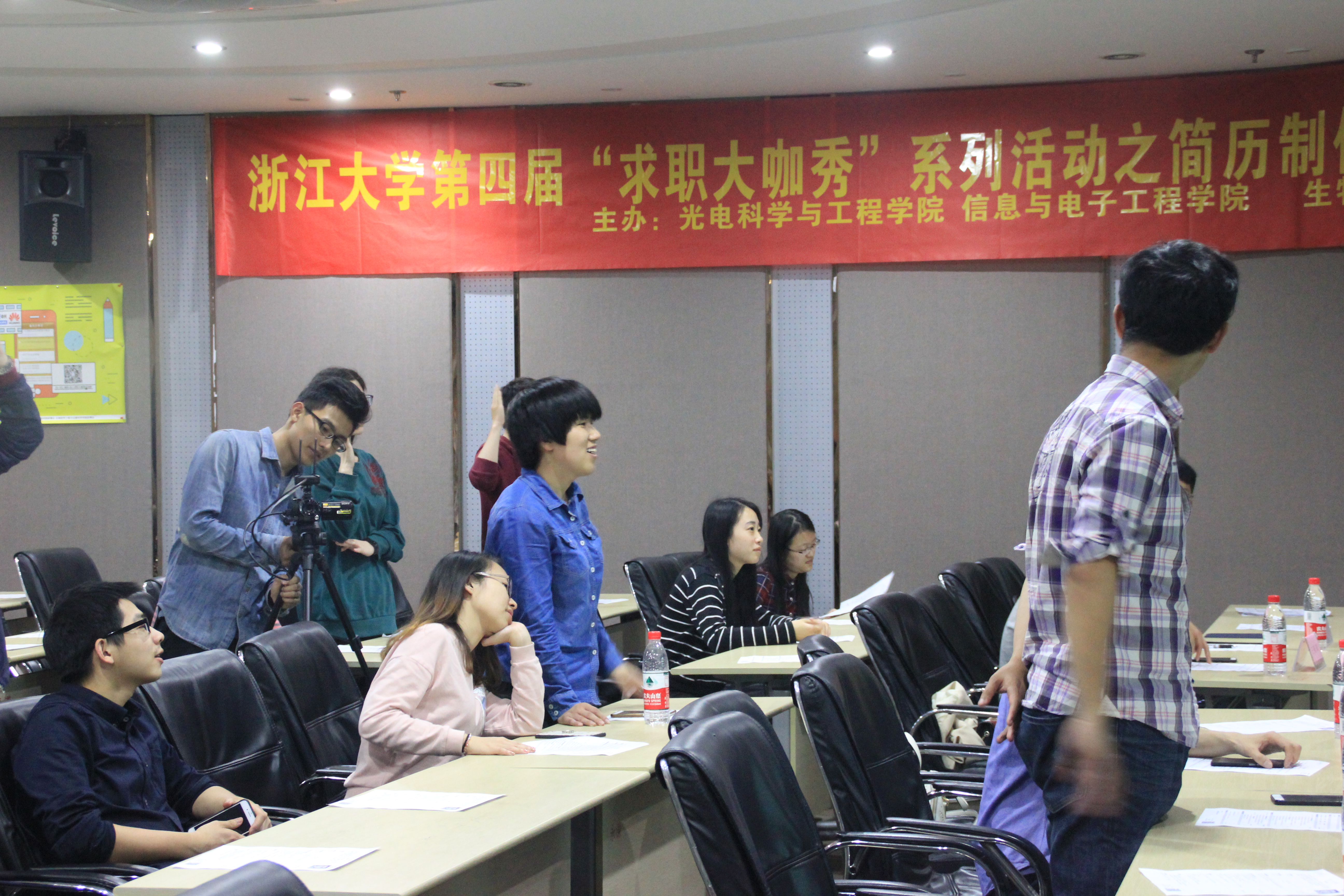 2017年4月15日晚,光电、信电、生仪三院联合举办的浙江大学第四届“求职大咖秀”系列活动之简历制作培训在浙江大学玉泉校区永谦活动中心第一报告厅举办,承办方邀请到乔布简历公司商务总监和职业生涯规划指导师刘学英老师,活动吸引了诸多对研一、研二的同学前来参与,工作人员向每位参与者均分发了讲义。
