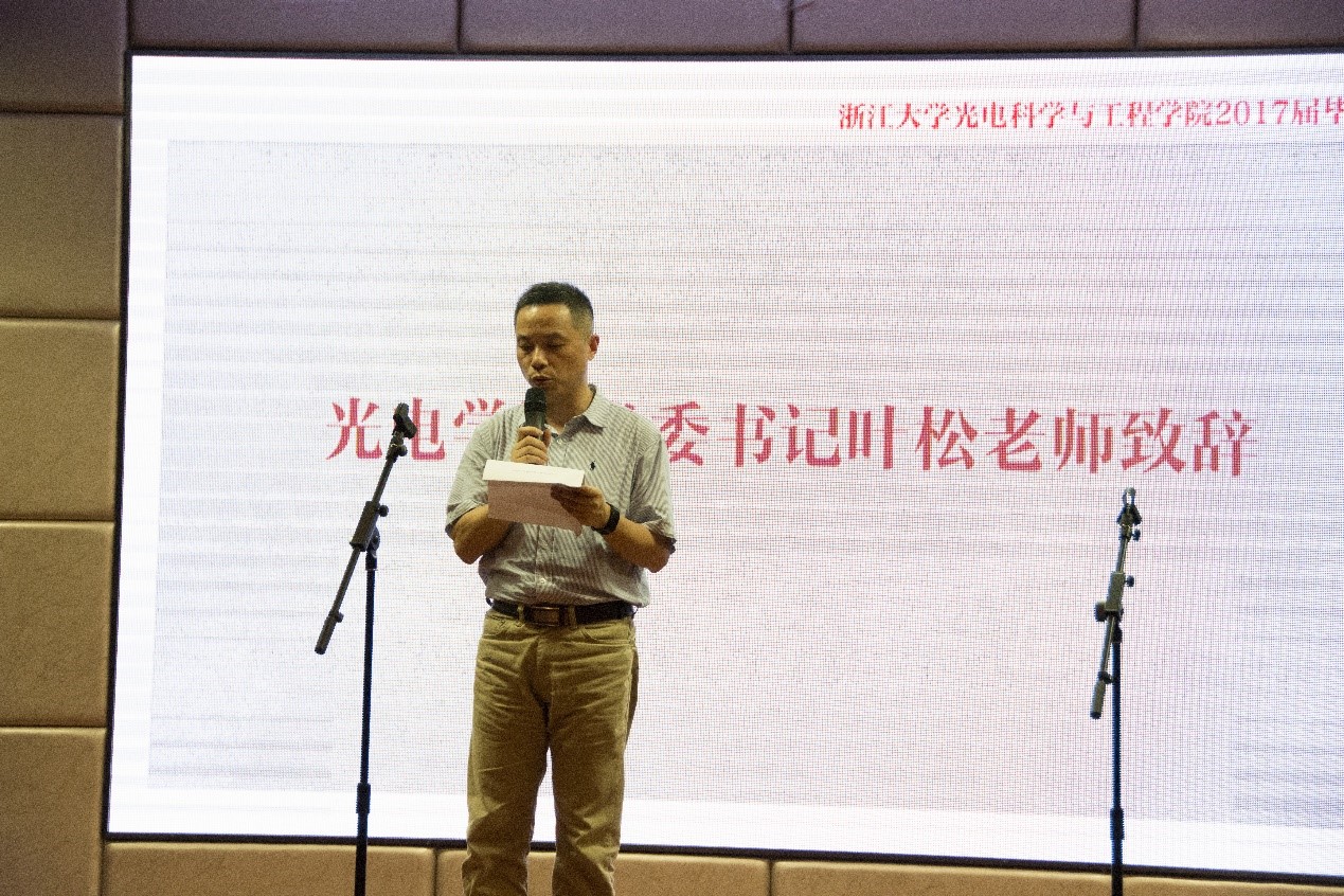 2017年6月9日晚七点半,“吾梦逐光”——光电学院2017届毕业晚会在教工活动中心隆重举行。学院党委书记叶松老师老师、浙江大学校友会光电学院分会会长李五一老师、学院副院长白剑老师、党委副书记刘玉玲老师、1301班班主任时尧成老师、1303班班主任袁波老师以及13级辅导员吕成祯老师和光电学院毕业生欢聚一堂,共同见证2017届光电毕业生的成长,共同分享大家在成长过程中的喜悦。