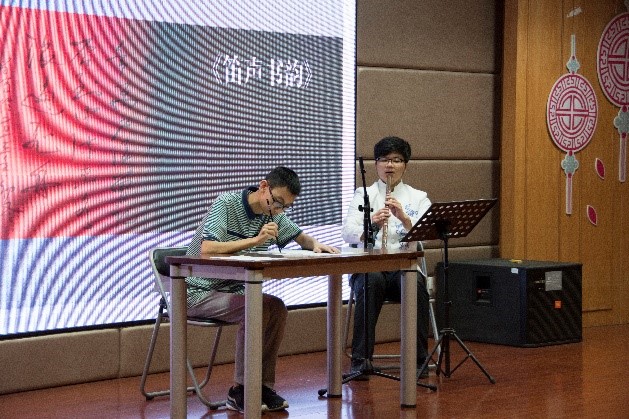接着,13级毕业生卢策同学为我们现场展示了其行云流水的书法,伴随着书法的是14级魏宇治同学的优美竹笛之声。即将相应国家号召援藏、援边号召,毕业将赴西藏工作的卢策同学为我们介绍了所写之诗的内容和寓意,并将自己内心的想法与大家进行了分享。接下来是由1301班带来的听歌识曲互动游戏,有趣的游戏伴着美妙的歌声,现场充满着欢乐的笑声。游戏之后,14级的陈睿同学为我们带了一曲深情的传奇。紧接着,毕业生张璋以其高超的技艺弹奏了一曲彩云追月,音色单纯而丰富,柔如冬日阳光,温暖平静;冷如撒向冰面的钢珠,颗颗透骨;烈如咆哮的深海,撼人心魄。