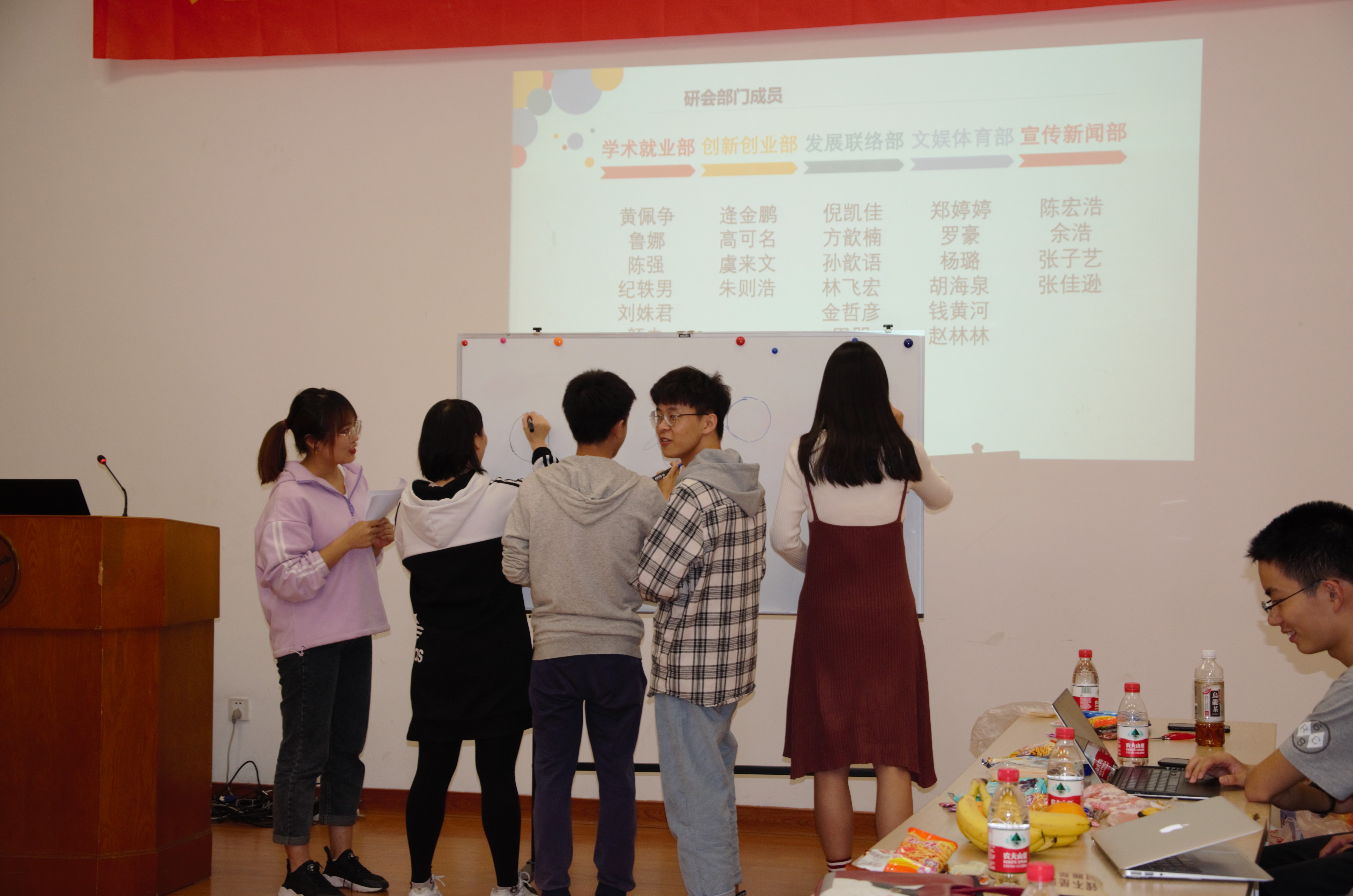 首先,在研会主席黄佩争同学的主持下,每一位研会成员做了简单的自我介绍。本届研会由29名同学组成,分属于学术就业部、创新创业部、发展联络部、文娱体育部、宣传新闻部5个部门。