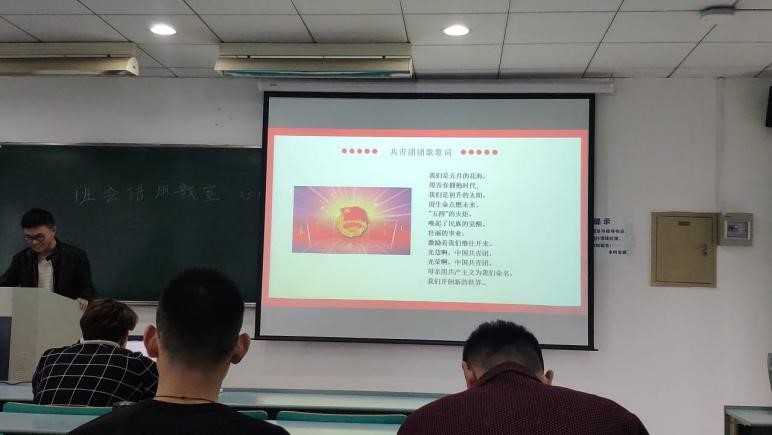 在1点40分左右,班中同学已经基本到齐,活动也正式开始进行。第一个环节是党团知识普及,主要由团支书普及一些基本的党团知识,比如共青团的建立者、建立地点以及成立时间,当然也有共青团团徽、团旗、团歌的确定时间及寓意,并且播放了团歌,图为播放团歌与介绍团徽的照片。通过这一环节,让同学们了解了共青团的起源,是在1920年8月22日,上海社会主义青年团由俞秀松、施存统等8人正式发起建立。1921年7月,中国共产党成立后,派出了许多党员去加强对各地团的早期组织的领导工作,也让同学们了解了党与团不可分割的关系。