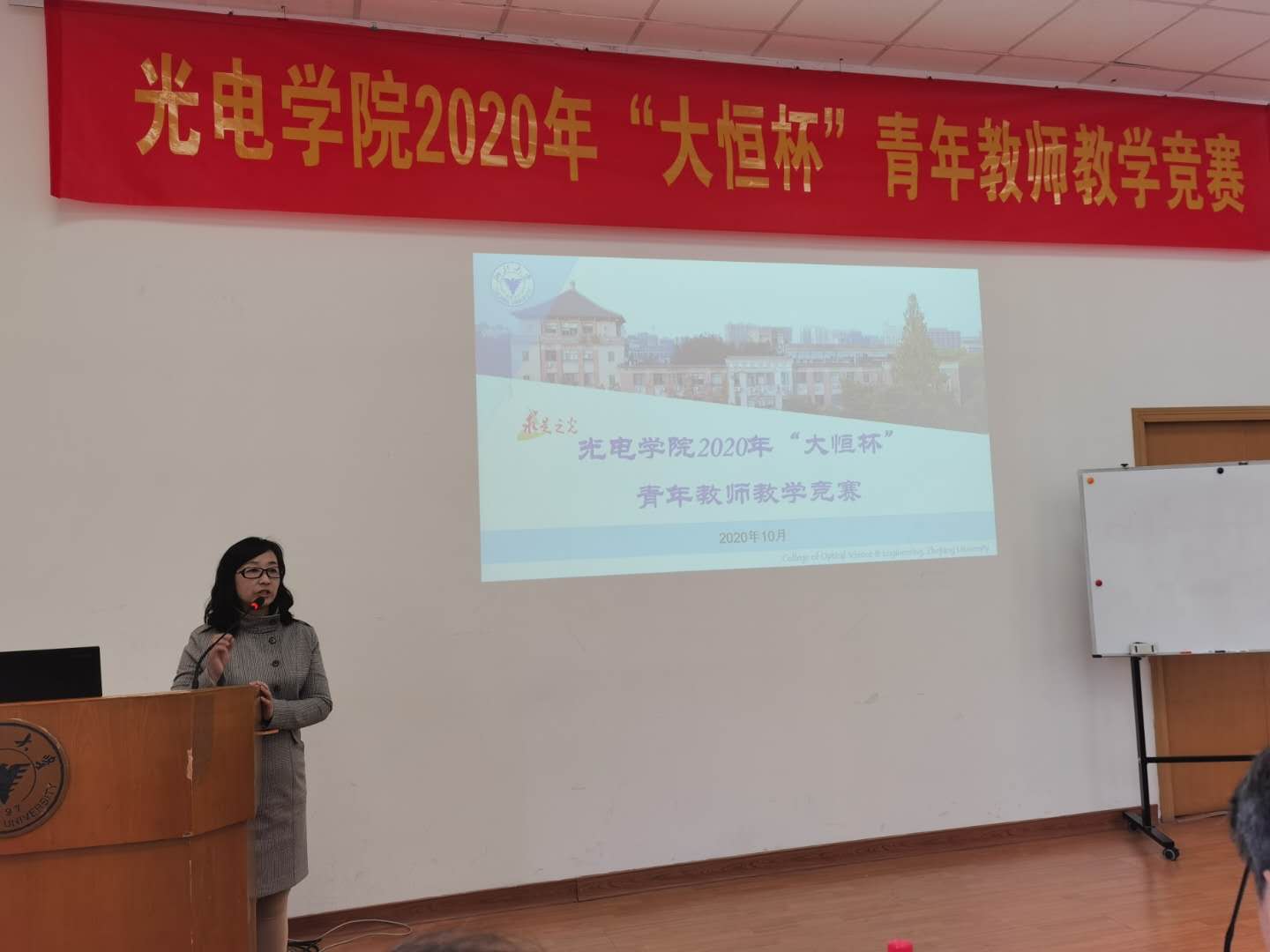 为加强青年教师队伍建设,促进青年教师树立现代教育理念,提升青年教师教学素养与教学水平,10月30日,光电学院青年教师沙龙——青咖时光第五期暨“大恒杯”青年教师教学竞赛在玉泉校区教三440会议室举行。本次活动由学院教学副院长郑臻荣、党委副书记郑丹文、实验中心主任郑晓东、优秀教师叶辉和李晓彤担任评委,并邀请了北京大恒光电高校实验部总经理李秀芳担任特邀评委。未承担本科教学任务的青年教师观摩了比赛。