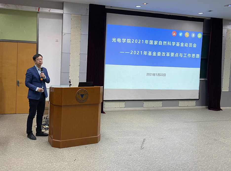首先戴道锌做了光电学院2021年国家基金动员会报告。报告通过详实的数据,系统地回顾并总结了学院2020年国家基金申请及获批情况,并对学院2021年国家基金申报工作做了全面安排和部署。