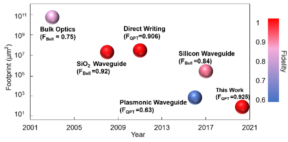 为此,浙江大学光电学院/现代光学仪器国家重点实验室戴道锌教授团队和中科大郭光灿院士团队任希锋教授课题组合作研究,提出基于密集波导超晶格阵列的硅基片上CNOT门,通过亚波长尺度光场局域和光场耦合特性的精细调控,构建并实现了世界上最小尺寸的新一代片上集成CNOT门。其尺寸仅4.8×4.45 μm2 (λ@1550nm),相比于传统介质波导CNOT门降低了10000倍以上,大幅提高了集成度。研究团队进一步研制了片上量子态制备及分析系统,测试表明该CNOT门保真度达0.925±0.008。此项工作为实现大规模量子信息处理系统提供了核心基础器件。
