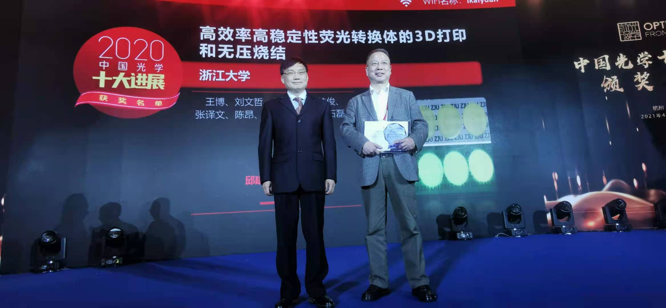 4月25日,首届光学前沿高峰论坛暨2020年度中国光学十大进展颁奖典礼在浙江杭州举行,量子纠缠光源、荧光成像、金属钠等离激元等10项基础研究,激光聚变、光学雷达远距离成像、光谱气体检测等10项应用研究入选“2020年中国光学十大进展”。 我院邱建荣教授团队“荧光转换体的3D打印和无压烧结技术”荣获“2020年中国光学十大进展” 应用研究类。