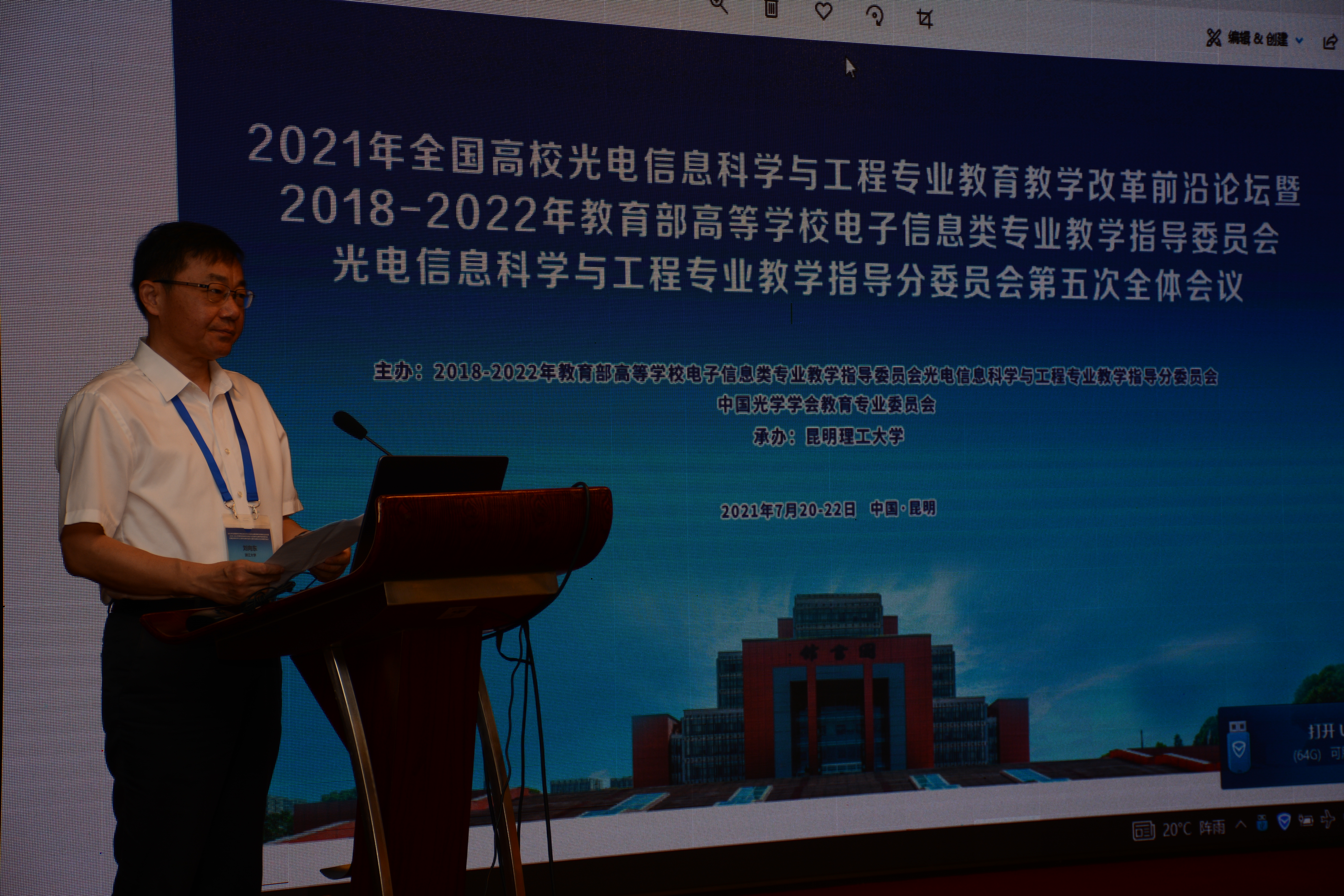 7月20-22日,2021年全国高校光电信息科学与工程专业教育教学改革前沿论坛暨2018-2022年教育部高等学校电子信息类专业教学指导委员会光电信息科学与工程专业教学指导分委员会第五次全体会议在昆明理工大学举行。会议由教育部高等学校电子信息类专业教学指导委员会光电信息科学与工程专业教学指导分委员会(以下简称“光电教指分委”)、中国光学学会光学教育专业委员会主办,昆明理工大学承办,大恒新纪元科技股份有限公司、武汉光驰教育科技股份有限公司、北京杏林睿光科技有限公司、云南智旅会会展服务有限公司协办,光电教指分委成员、名誉委员、秘书处成员、协作委员、联络员和光电教指分委教研项目负责人等来自全国高校光电信息科学与工程专业(以下简称“光电专业”)的140余位专家学者参会。