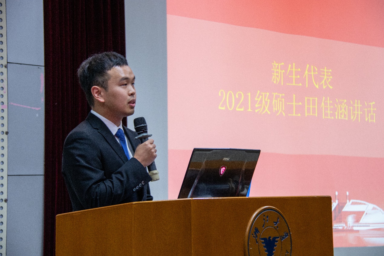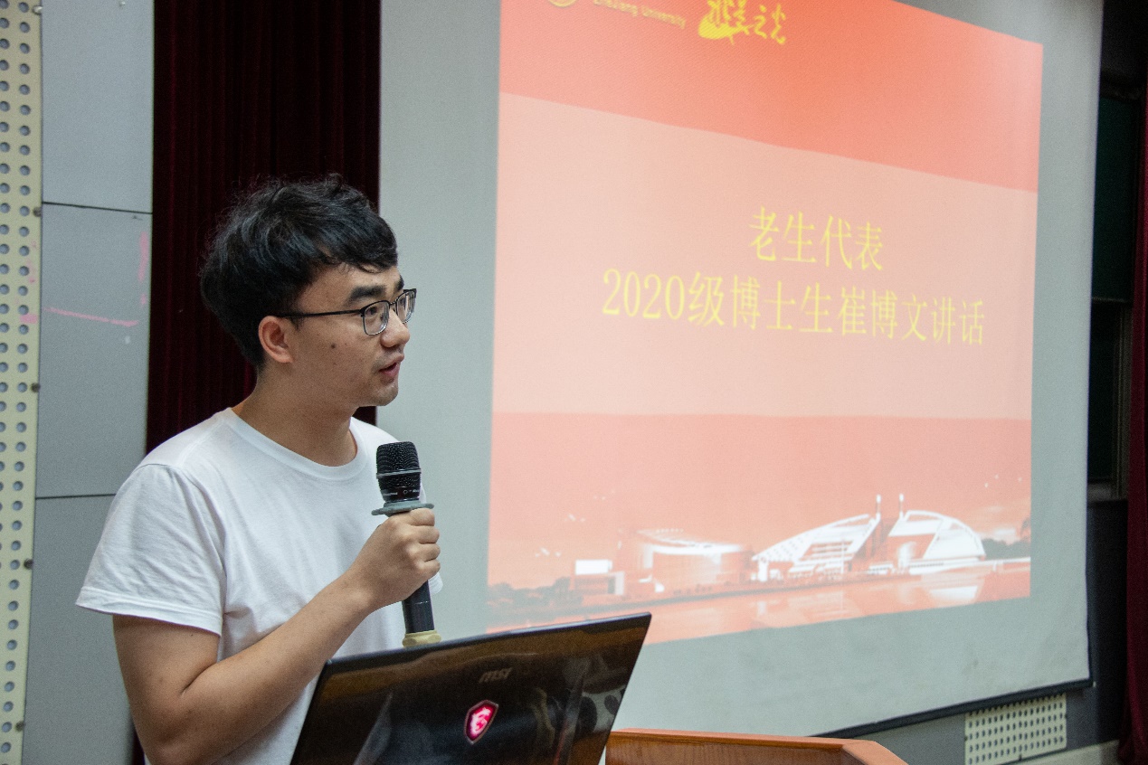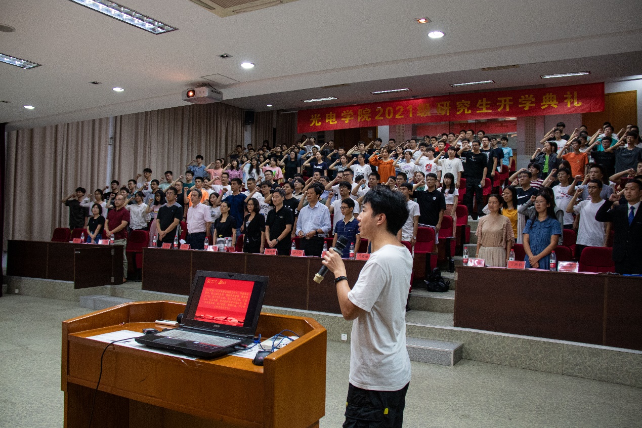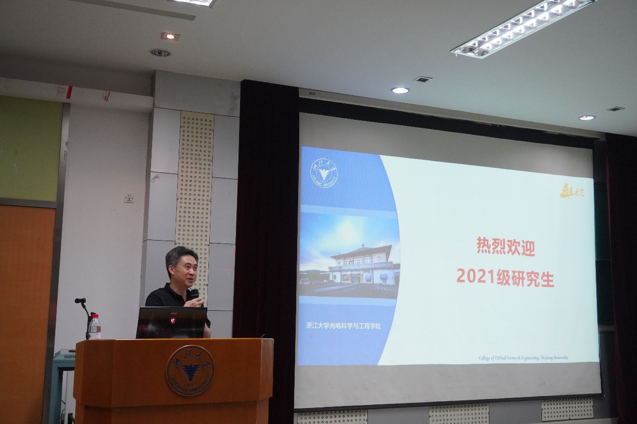 在老生和新生代表讲话环节,高年级学生代表2020级博士生崔博文同学结合自身的学习和实践经验,鼓励大家永远要保持充足的自信;科研路上大胆动手,敢于提问、不惧争论,努力迸发出自己独一无二的光辉。新生代表2021级硕士生田佳涵同学表示,将肩负起时代委以的重任,以与时俱进的精神、革故鼎新的勇气、坚忍不拔的定力面对未来可能遇到的重重挫折,投身科技强国伟业,努力做一名有家国情怀,有民族使命感的浙大光电人。