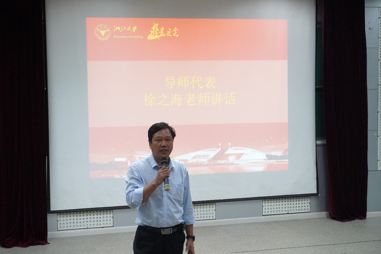 随后,徐之海老师作为研究生导师代表讲话。徐老师结合自身的科研经历,为同学们提出两点建议:一要勇于挑战、不折不挠,二要做一个有梦想的研究生。同学们要把自己前途命运和国家的发展结合起来,为更加积极主动的为国家和社会做贡献,他希望同学们目光长远、甘于奉献,不要成为一个精致利己主义者。