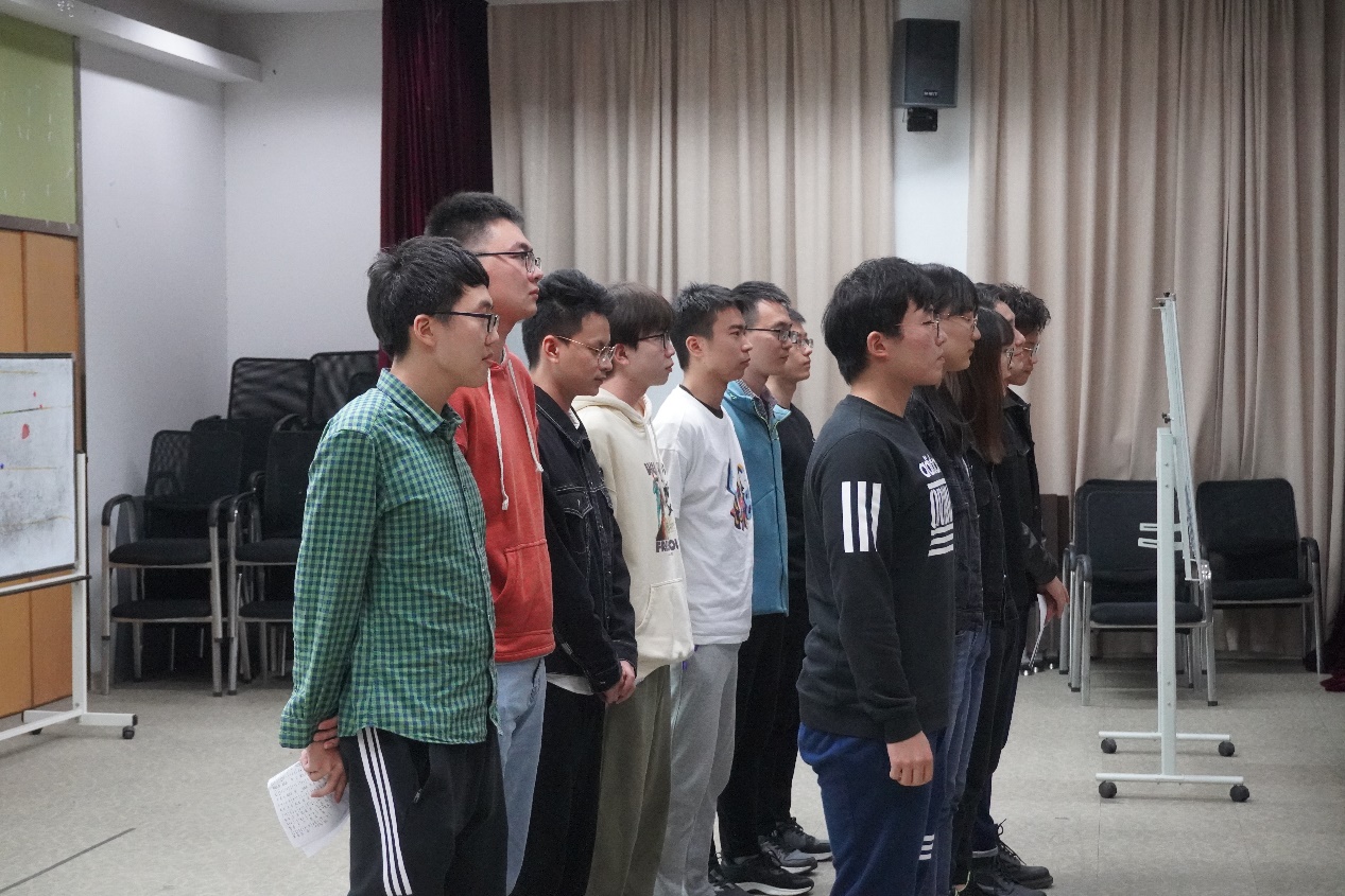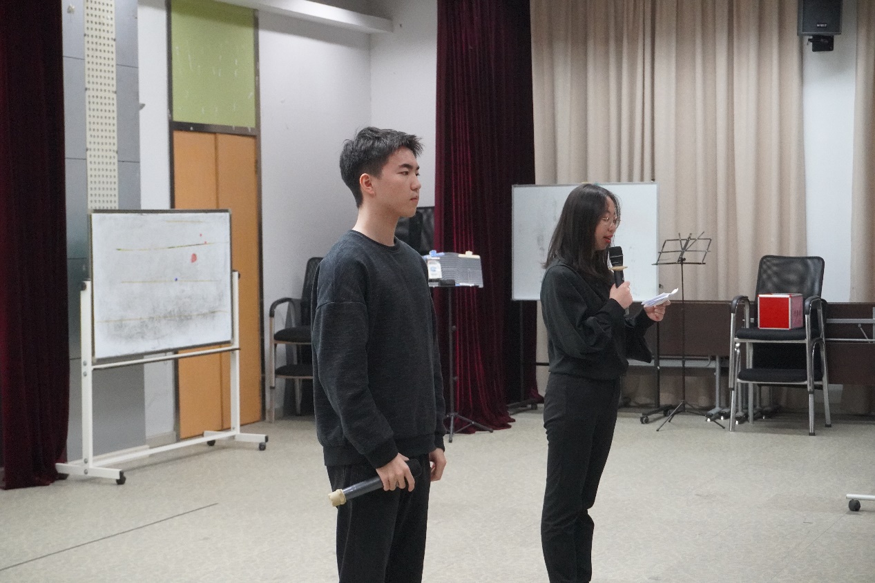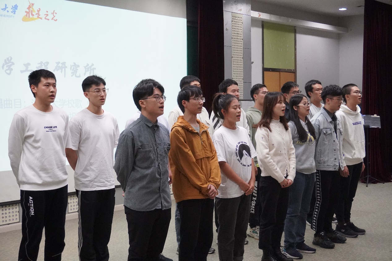 本次歌唱比赛的主持人为研究生邹鸿博与顾佳美。在一段开场白后,他们为我们介绍了比赛的要求和评分细则:每个研究所队伍除演唱校歌外,还要自选一首曲目进行演唱;从队伍的精神面貌、演唱技艺、服装、特色展示四个方面进行评分。