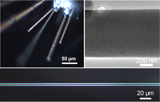 本次研究中,童利民团队自行搭建了生长装置,在大量实验基础上,改进了已有的电场诱导冰晶制备方法,在低温高压电场中,辅之以一定的湿度条件,通过静电促使水分子朝电场方向运动,改变其无序的运动状态,从而诱发单晶生长。最终在-50℃的环境中,成功制备出直径在800纳米到10微米的冰单晶微纳光纤。并且,该团队还利用新发明的低温微纳操控和转移技术,在-150℃的环境中,使冰微纳光纤获得了10.9%的弹性应变,接近冰的理论弹性极限。