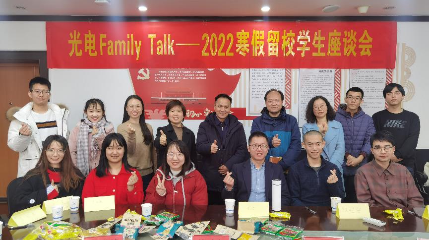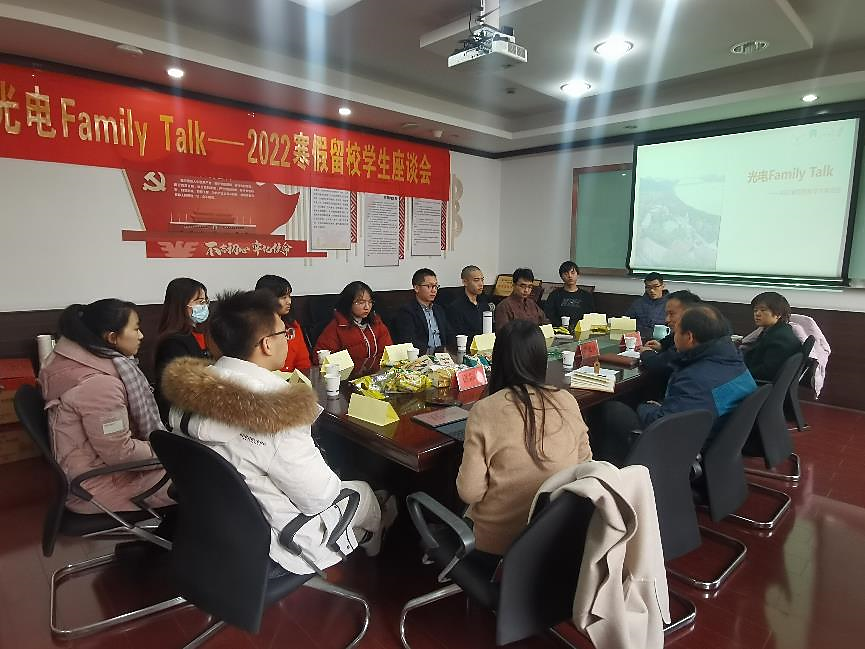 2022年1月18日,光电学院第六期Family Talk——寒假留校学生座谈会在教三338顺利举办,学院院长戴道锌、党委书记毕建权、信息学部谌群芳及辅导员张曼华、査蒙与留校学生近20人团聚一堂,进行了亲切的面对面交流。座谈会由学院党委副书记赵传贤主持。