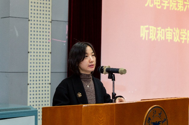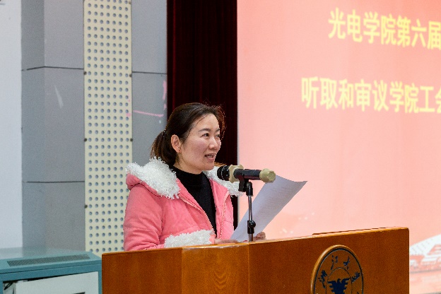 工会主席冯华君代表学院第五届教代会、工会会员向大会报告了工会工作情况。四年以来,学院工会在院党委的领导下,充分发挥桥梁纽带作用,以营造和谐学院文化、促进光电事业发展、建设国际一流学科为目标,着力创新工会工作格局,健全教代会制度,协助加强师德师风建设,组织多样化教职工活动,持续关心教职工生活等。学院工会牵头申报的“‘青咖时光’光电学院青年教师沙龙活动”被评为浙江大学第二届教职工“一院一品”文化品牌项目。后续,工会将继续围绕学院中心工作,不断提高全院教师归属感、认同感,增强学院整体凝聚力,为学院的稳定与发展做出积极贡献。