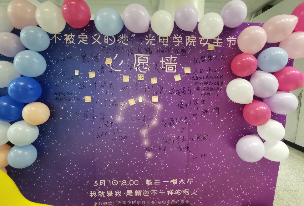 为活跃校园文化氛围,营造轻松温馨的节日气氛,3月7日晚18:00,在教三一楼大厅,由光电学院团委、学生会与研究生会联合主办的“女生节”活动如约而至。活动开始前,工作人员摆放了精心装扮的心愿墙,进行活动预热。在这个属于自己的节日中,路过的女生们纷纷留下自己的愿望,让一瞬间的期望成为永恒。