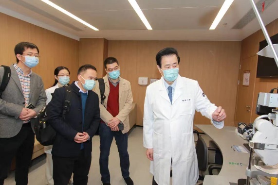姚克对于戴道锌一行的到来表示热情欢迎,陪同参观了眼科医院视光中心、屈光手术中心、特检中心、远程医学中心和显微操作培训中心等。随后,他介绍了眼科医院的发展历程、学科建设和未来规划,并表示光学与眼科具有天然的联系,在各类眼科医疗设备的设计原理及应用中都发挥重要作用,在医工结合的大背景下,深入开展多维度、多层面交叉研究,将为各自学科发展开辟新方向。