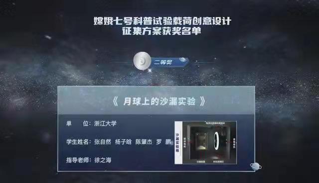 4月24日,在中国第七个航天日当天,中国探月工程公布了嫦娥七号、小行星探测科普试验载荷创意设计征集获奖名单。由我院张自然、陈肇杰、罗鹏同学与计算机学院杨子晗同学设计,徐之海教授指导的方案——“月球上的沙漏实验”成功入围嫦娥七号科普载荷创意征集竞赛终选阶段,并获得全国二等奖。