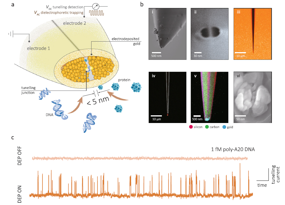 图1结合介电泳分子操控的隧穿结器件与单分子超低浓度电学测量 (Tang et al., Nat. Commun., 2021, 12, 913)