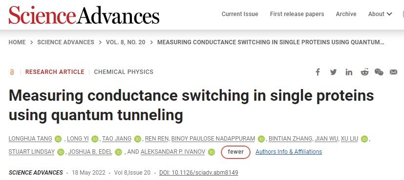 5月18日,《Science Advance》杂志在线发表了浙江大学光电科学与工程学院唐龙华课题组和英国帝国理工学院Aleksandar P. Ivanov 和 Joshua B. Edel等团队合作的题为“Measuring conductance switching in single proteins using quantum tunneling”的研究论文。该研究中利用量子隧穿结器件(quantum mechanical tunnelling probes)实现了单分子蛋白质的长时电导测量,观察到了室温、溶液环境中单个蛋白质分子的偏压依赖下电导动态响应。Science Advances官网以“Quantum tunneling measures charge of single proteins”进行了图片亮点报道。该器件技术有望用于探究蛋白质在生物过程中的实时构象与功能机制,在蛋白动态功能表征、生物光电子器件等领域具有重要应用价值。