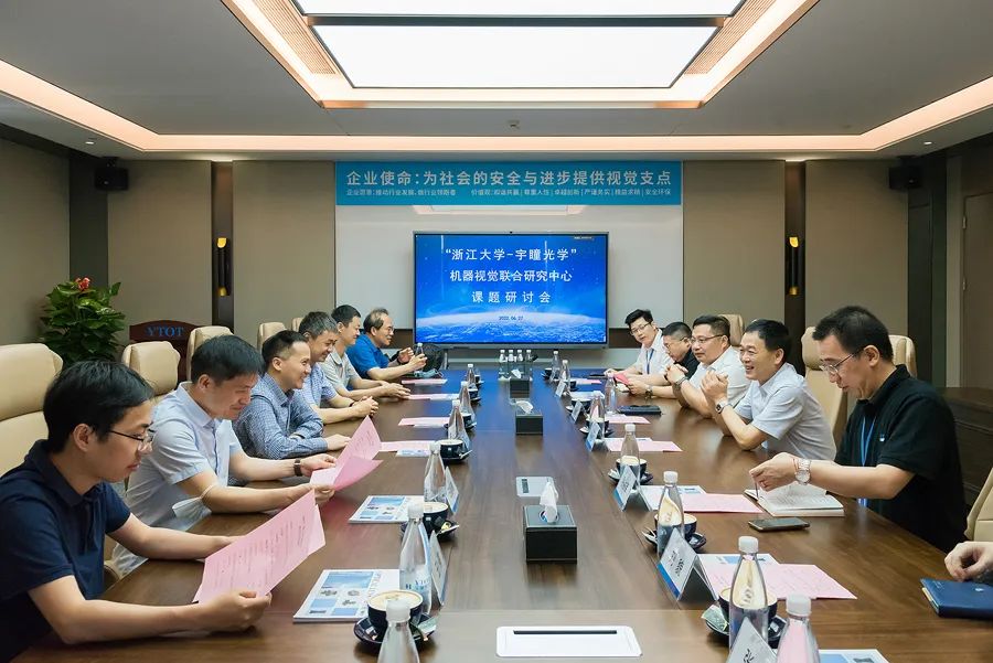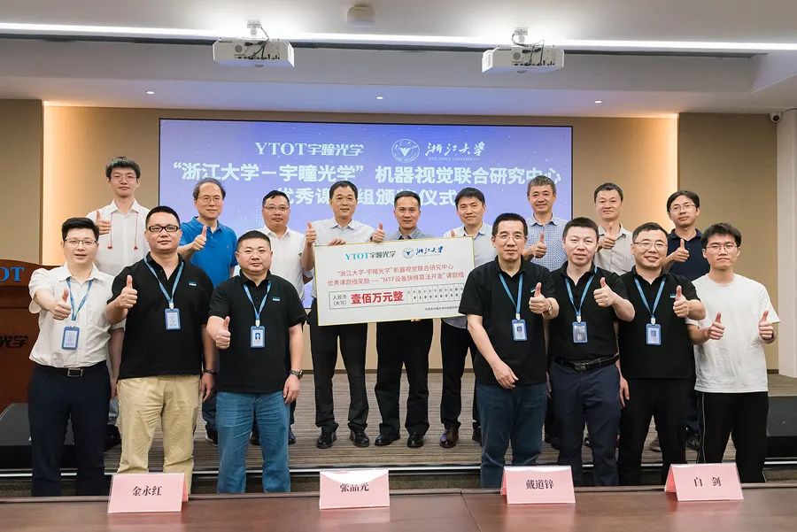 627日上午,戴道锌院长一行来到东莞市宇瞳光学科技股份有限公司。学院与宇瞳光学在2020年成立了 “浙江大学-宇瞳光学机器视觉联合研究中心”,白剑、李奇和汪凯巍等教授与宇瞳光学有着十分紧密的技术合作。戴院长高度评价了学院与宇瞳光学的校企合作模式,希望这种模式能够成为一种标杆、一种范本,被广泛复制推广,充分发挥学院自身优势,解决企业需求,实现互惠互利、合作共赢。白剑教授对前一阶段的合作表示十分满意,希望双方能够更加紧密交流,扩大大学生光学设计竞赛的参赛规模,进一步挖掘和扩展合作研究领域。在前期合作中,汪凯巍教授带领的“MTF设备狭缝算法开发”项目组取得突破性进展,被评为联合研究中心优秀课题组。宇瞳光学为课题组举办颁奖仪式,董事长张品光、总经理金永红和戴道锌院长共同为汪凯巍教授颁奖,并奖励一百万人民币。
