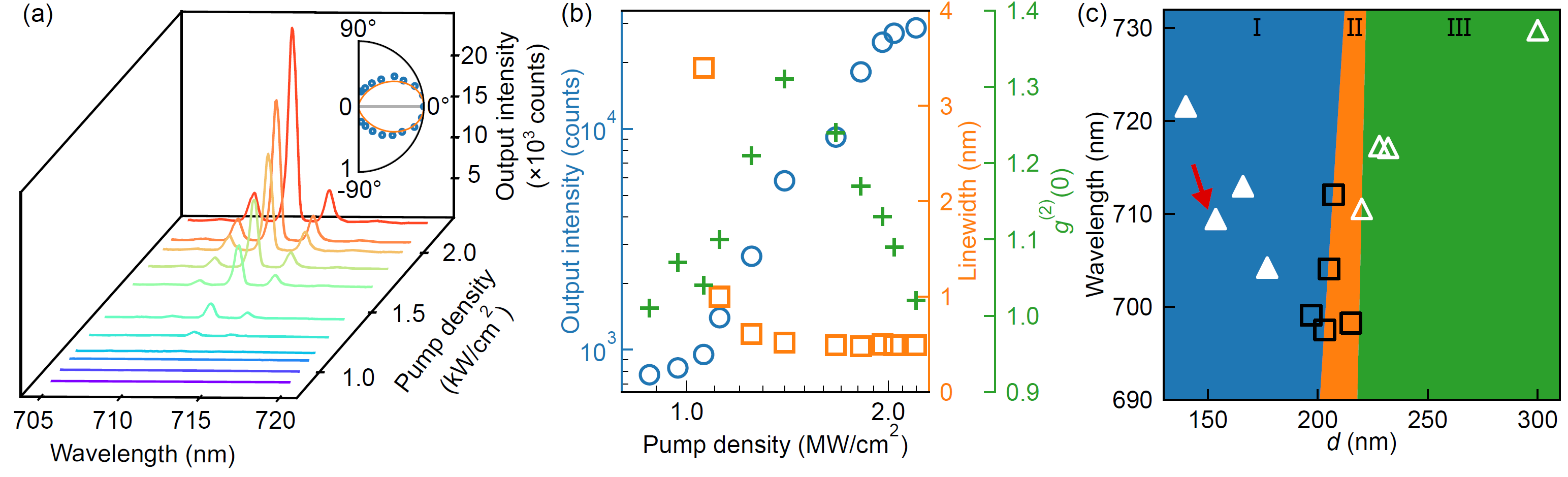实验上,团队通过微纳操作将两根CdSe纳米线紧密并排形成CNP结构,利用聚焦离子束加工切平两端端面作为激光腔反射镜(图3)。高分辨透射电镜测量结果表明,纳米线的单晶结构近乎完美,基于表面粗糙度密排的CNP领结型截面的中心缝隙宽度约为1nm。在532nm波长纳秒激光脉冲激发下,从纳米线端面测得中心波长约为710nm的激光输出,其输出偏振、激光阈值、光子二阶相干度等实验测量结果均符合理论预测的类TE0模的激光特性(图4),表明在实验上实现了具有亚纳米级场约束的激光输出。