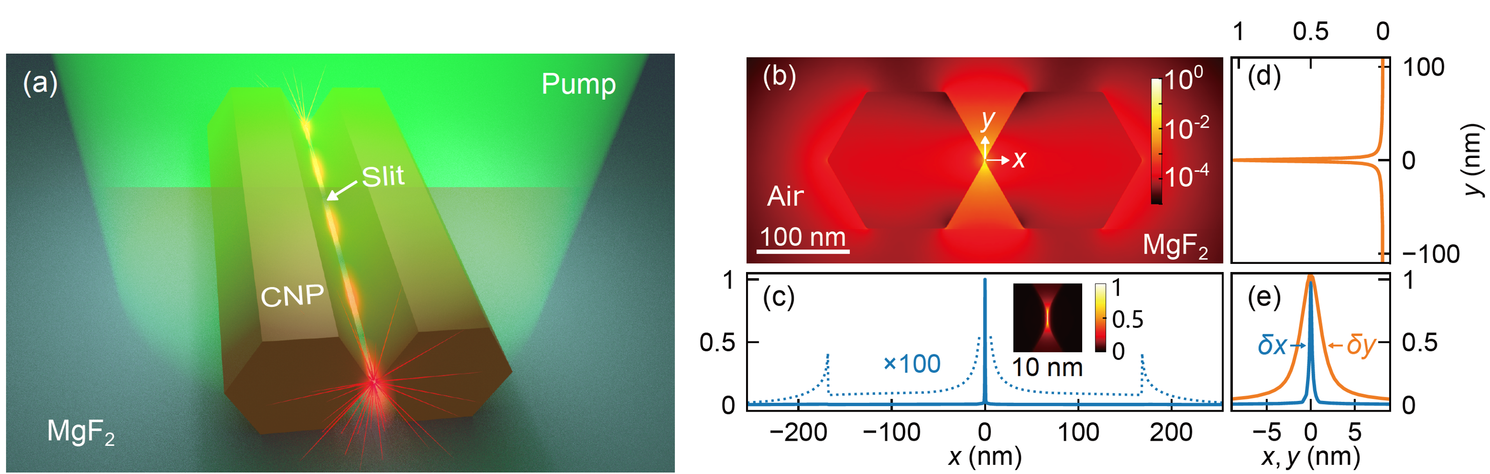 计算结果表明,由直径170nm的CdSe纳米线组成的1nm缝宽的CNP结构,通过两个纳米线独立模式的强耦合,可以形成一种具有低传输损耗、低激光阈值的类TE0导波模式。在模场中心,基于缝隙两侧束缚电荷的相干极化与共振,产生空间尺度0.3nm的极端约束光场(图2,右图)。作为光子在空间坐标上受到极端约束的动量补偿(测不准关系要求),该模式存在一个大于衍射极限的背景场,强度比中心峰低30dB。同时,由于背景场的存在,腔内光场与自由空间光场的动量失配较小,腔内极端约束光场的输出效率远高于同等约束程度的理想小孔透射场或表面等离激元光场。