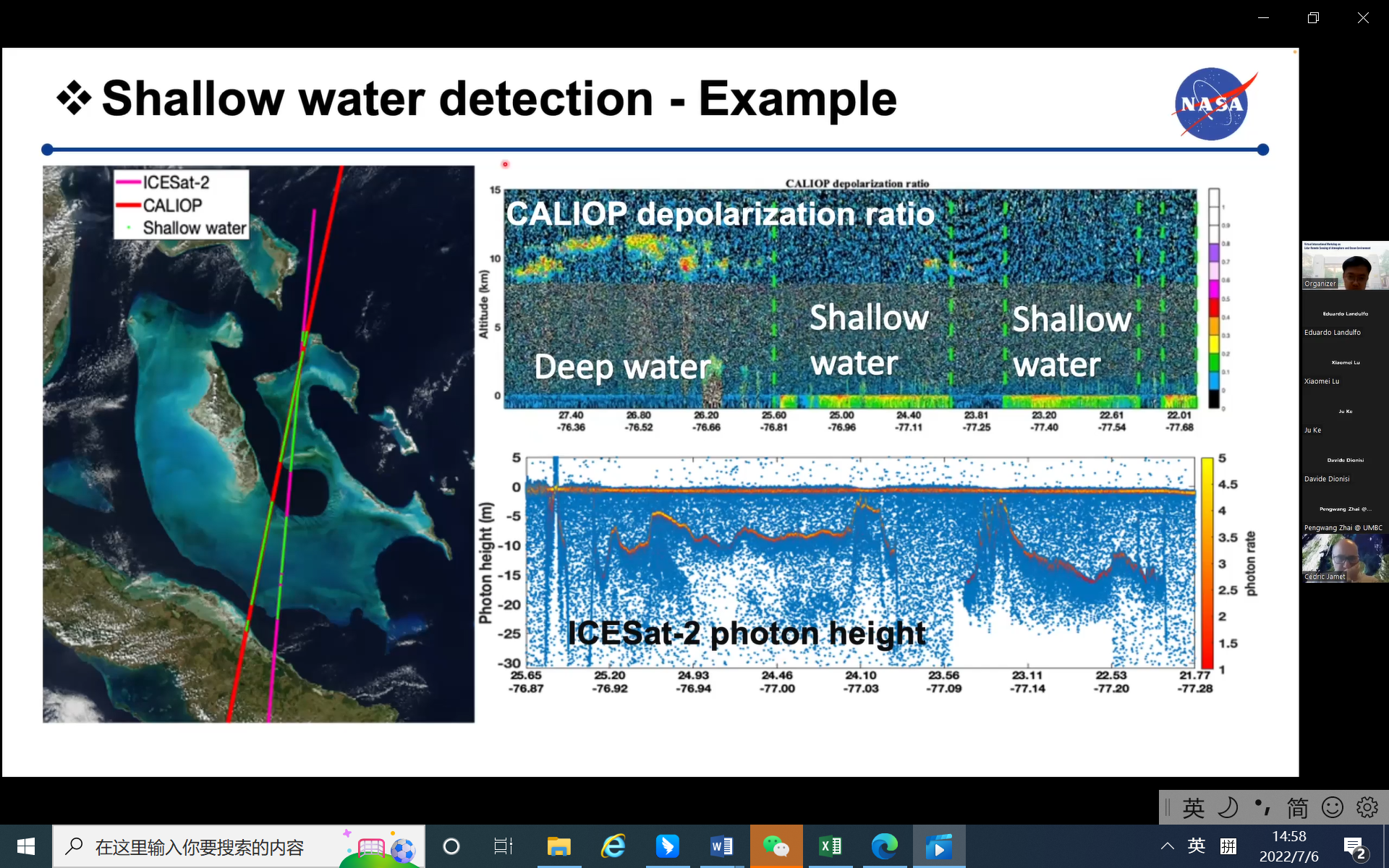 在星载激光雷达数据应用方面,来自意大利国家研究委员会Davide Dionisi博士展示了利用星载激光雷达数据反演海洋光学特性的研究,并介绍了意大利即将发射的卫星计划。美国NASA兰利研究中心Xiaomei Lu博士证明了使用卫星激光雷达数据进行近岸浅水探测、测深和海底生态系统研究的可行性,这项成果对于近岸导航、海啸和珊瑚礁群落在内的研究至关重要。法国里尔大学Cédric Jamet教授利用ARGO 浮标评估了星载激光雷达CALIOP的反演结果。