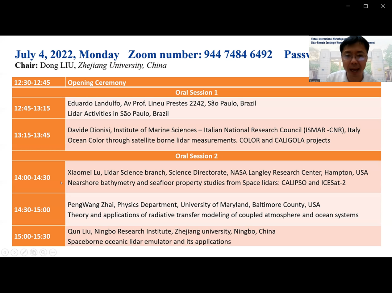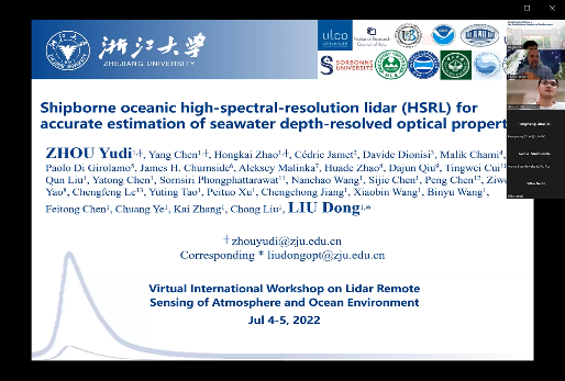 大气与海洋环境激光雷达遥感技术国际在线研讨会(Virtual International Workshop on Lidar Remote Sensing of Atmosphere and Ocean Environment)于2022年7月4日-5日以ZOOM视频会议的形式召开,本次会议由浙江大学主办,吸引了来自中国、美国、法国、巴西、波兰、意大利、德国等国家和地区的40多位专家学者参会。