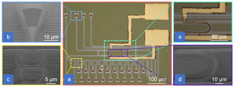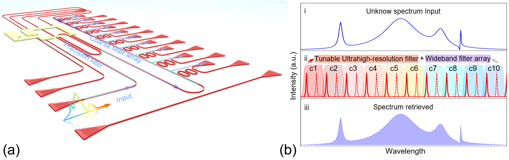 浙江大学光电科学与工程学院戴道锌教授研究团队提出了一种将超精细滤波与宽带滤波相融合的新方案,并基于硅光技术实现了超高分辨率的超小型片上光谱仪(图1)。特别是,该团队将欧拉曲线型超高Q微环谐振腔引入作为其超精细滤波器,从而极大地提升了光谱分辨率;与此同时,将级联双环阵列引入作为其粗滤波器组件,突破了精细滤波器自由光谱范围受限而导致的光谱探测范围问题。