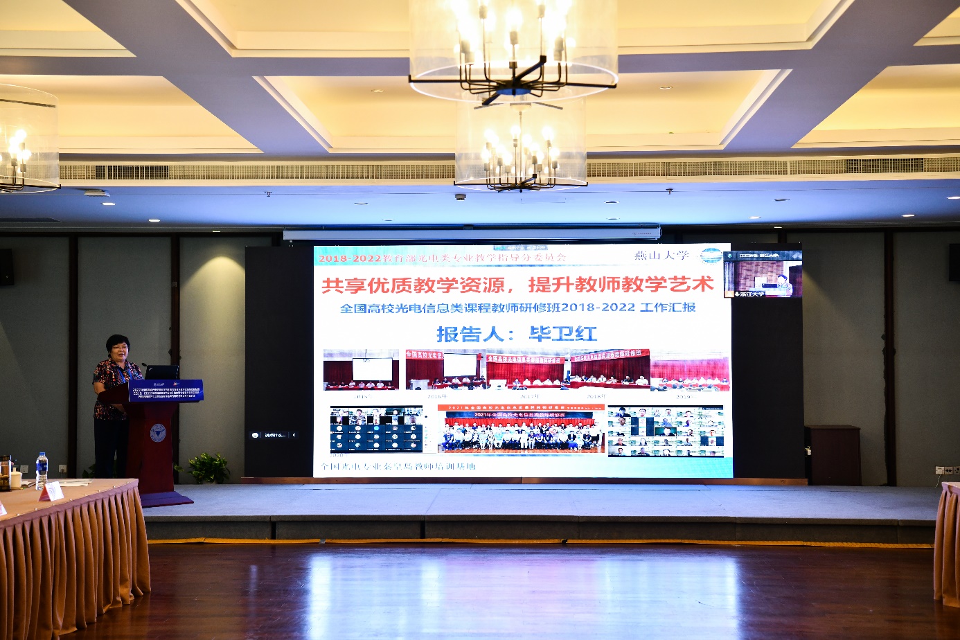 随后,光电教指分委主任委员刘旭对2018-2022年五年来光电教指分委所开展的工作进行了总结,详细介绍了光电教指分委在完成教育部任务、组织实施光电专业集成创新课和资源共享、建设“光电类”应用型系列教材建设、构建教师学习交流平台、推进创新创业教育和教学研究改革等方面的工作成果。光电教指分委名誉委员、秦皇岛师资培训基地主任毕卫红代表秦皇岛师资培训基地对2018-2022年的工作进行了总结。毕卫红回顾了5年来秦皇岛师资培训基地研修班课程开设、名师课堂、教学交流等建设情况,探索了优质教学资源共享模式。