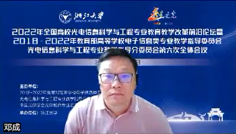 教育部高等学校电子信息类专业教学指导委员会秘书长邓成通过线上形式出席会议并致辞。他对会议的顺利召开表示热烈祝贺,对浙江大学承办本次会议表示衷心感谢。他回顾了近三年来全国光电信息科学与工程专业在光电教指分委的指导下的建设发展情况,指出光电专业的发展任重道远,希望各高校及教师能加强沟通与合作,为全国光电事业做出突出贡献。