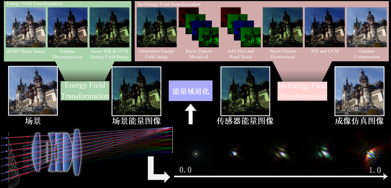 针对真实世界中不存在理想镜头能够完美记录场景细节的问题,陈世锜等根据成像链路,设计了整套光学成像仿真模型来准确模拟光学像差在数字图像上的表现。通过成像仿真系统构建的数据可以表征特定光学系统获取图像的过程并用于训练深度学习模型。该工作表明,即使仅在模拟的数据集上进行训练,基于深度学习的计算光学方法依然可以矫正真实成像系统的光学像差,实现接近衍射极限的成像质量。