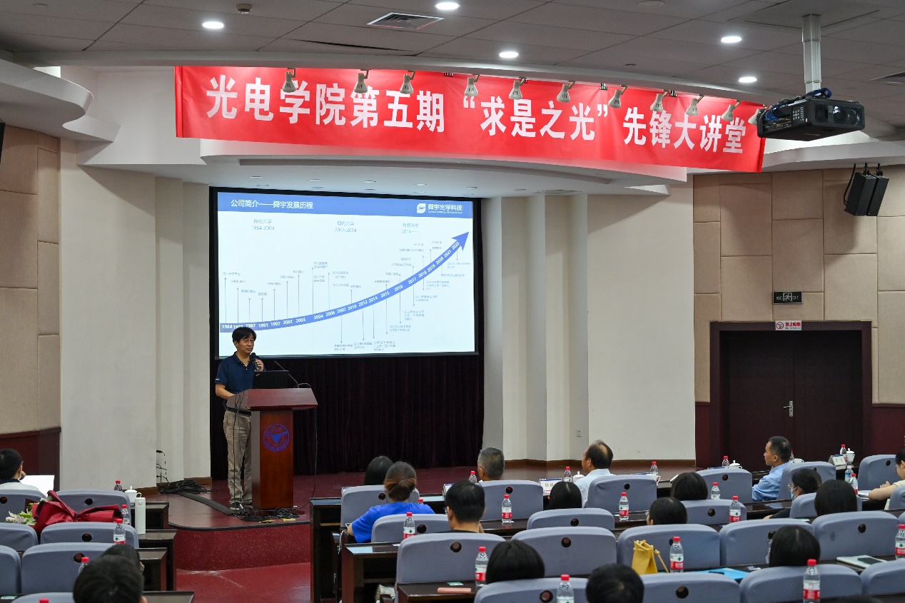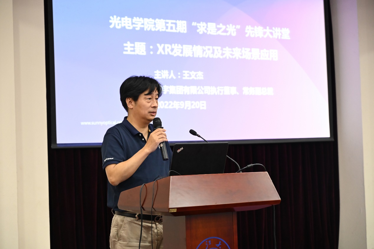 2022年9月20日下午,光电学院第五期“求是之光”先锋大讲堂在玉泉校区邵科馆117会议室举行,光仪85级院友、舜宇光学科技(集团)有限公司执行董事、常务副总裁王文杰受邀作了题为“XR发展情况及未来场景应用”的专场报告。学院院长戴道锌、党委副书记赵传贤、光学成像与检测研究所冯华君教授、学院校友分会会长李五一等100余名师生参加了报告会。报告会由学院党委书记毕建权主持。